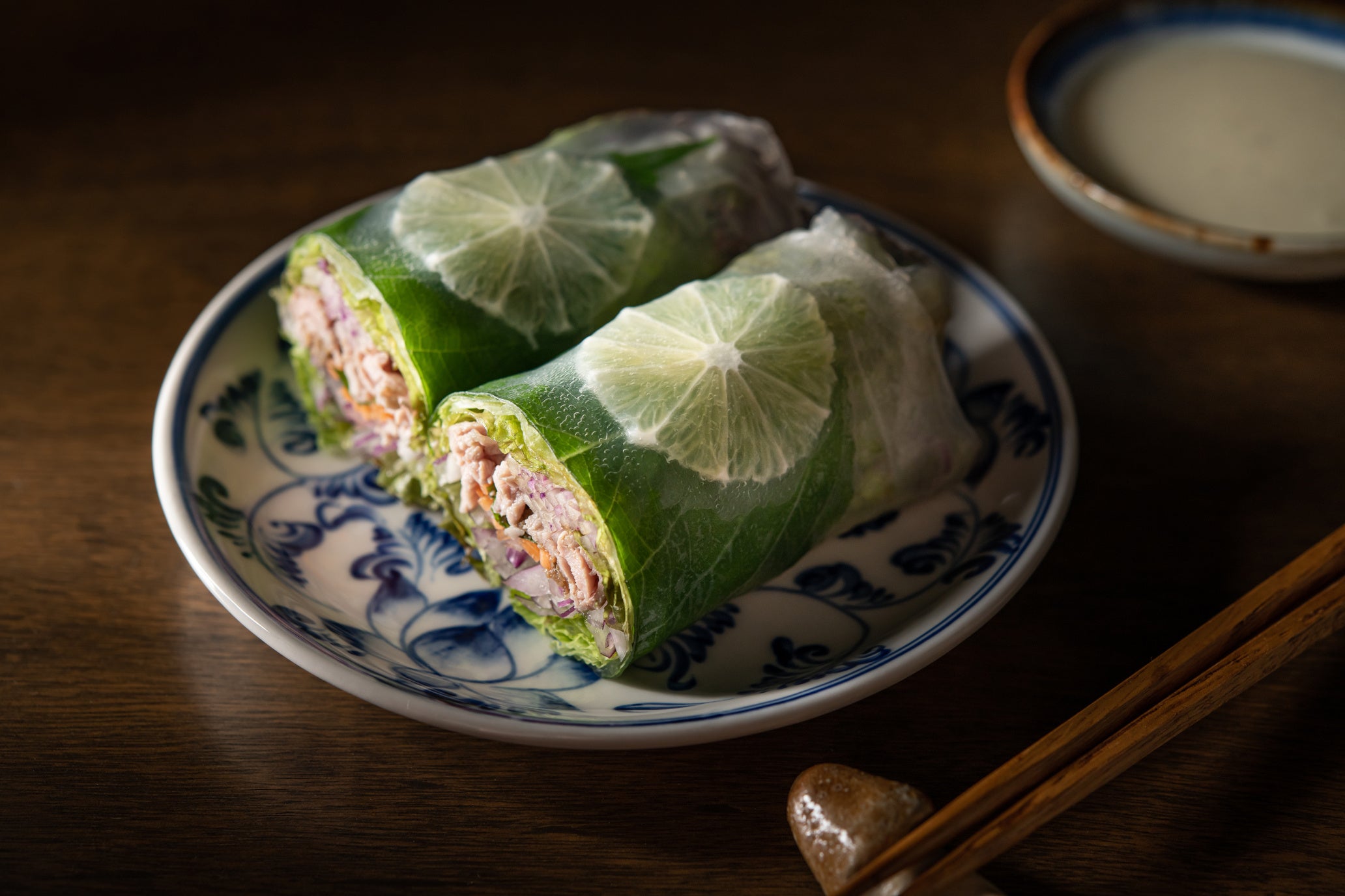 ラム肉の冷しゃぶ・きのこソース・ミント・エゴマ・ライムなどを巻いた、ヘルシーな生春巻きです。柚子胡椒ソースでお召し上がり下さい。(550円)