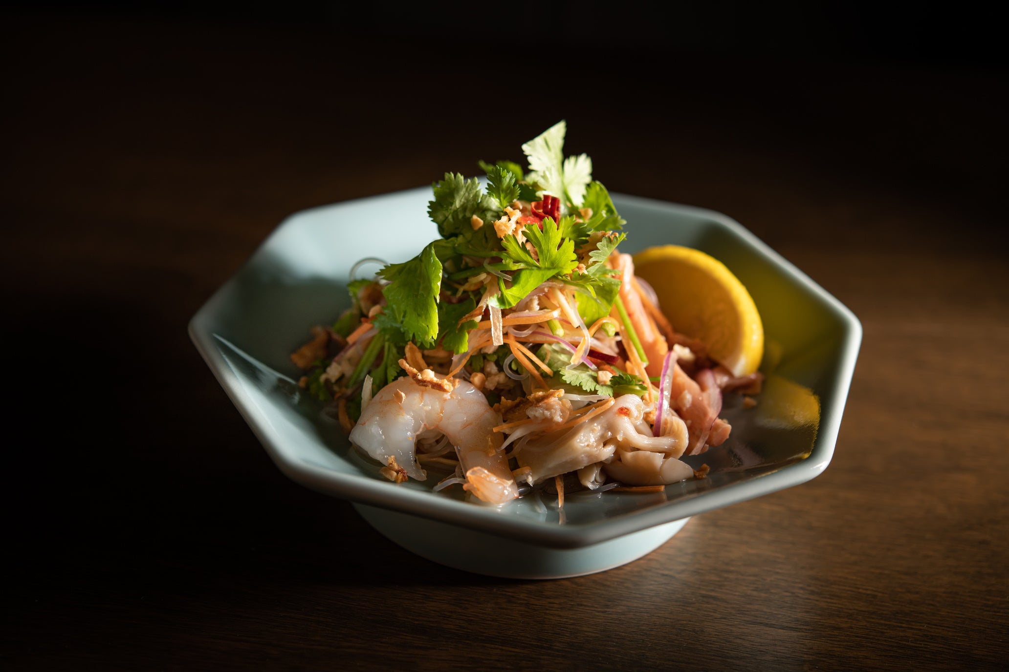 ショウガ・きのこマリネ・エビ・野菜などを、甘辛で酸味のあるタイ風の調味料で和えた春雨サラダです。(800円)
