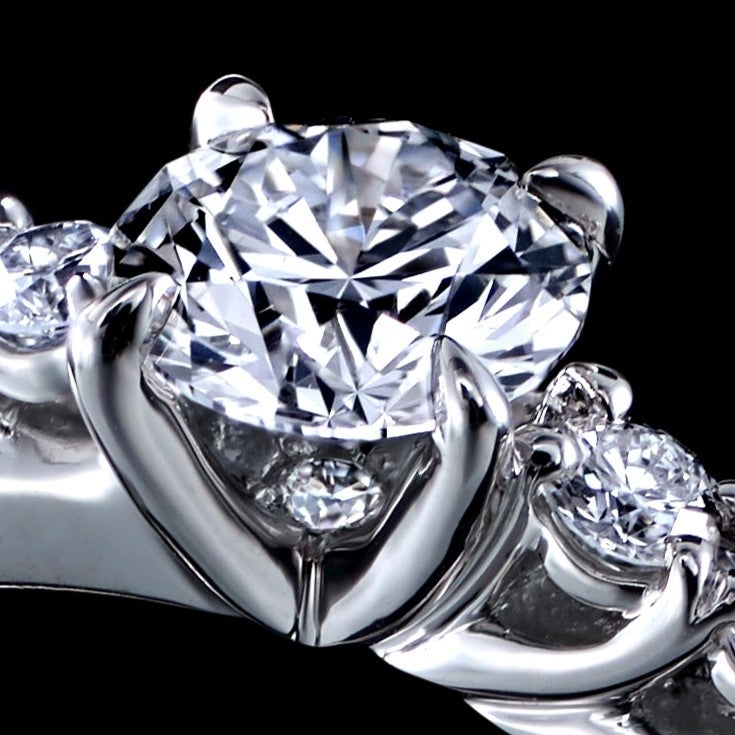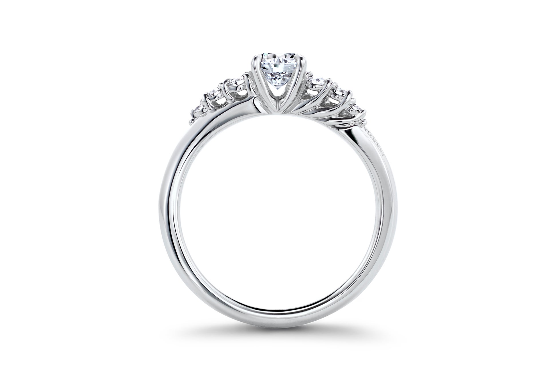 完璧に研ぎ澄まされたセンターダイヤモンドの煌めきを遮ることなく、輝かせるため4本の爪でセッティング。メレダイヤモンドに続くミルグレイン(ミル打ち)が上品な指元に。