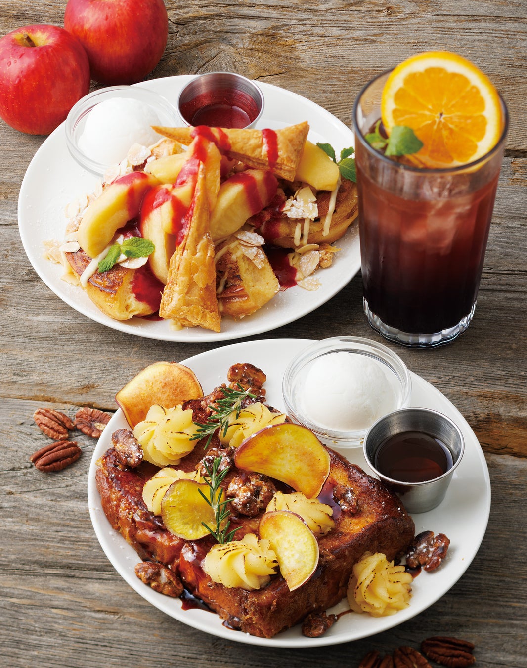 ゴロッとした自家製焼きリンゴ&サクサク食感のパイが自慢のフレンチトーストと好相性!ほどよいシナモンの香りが秋らしさを引き立てます。別添のラズベリーソースで味の変化も楽しんで。