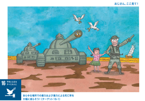本展は、飢餓問題も含めたSDGs(国連の定めた「持続可能な開発目標」)の17の課題をユーモアあふれるイラストで誰でも分かりやすく表現しています。