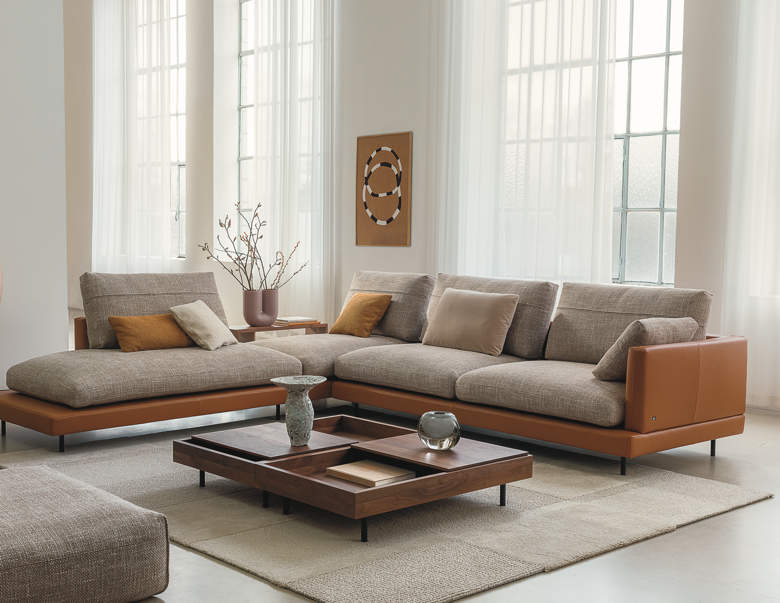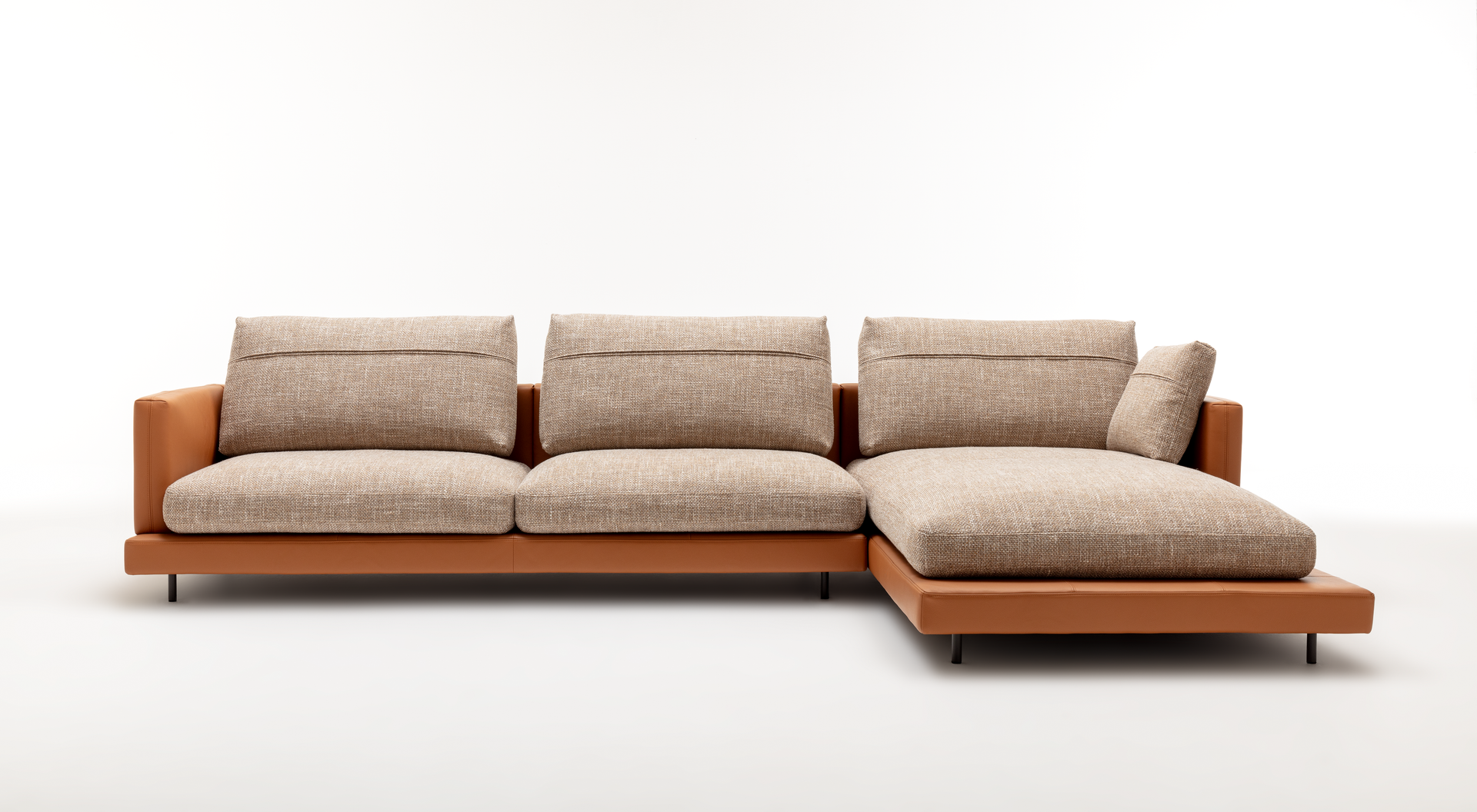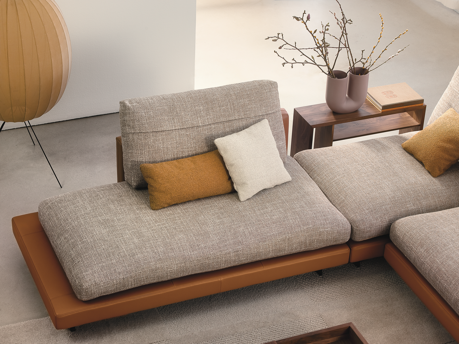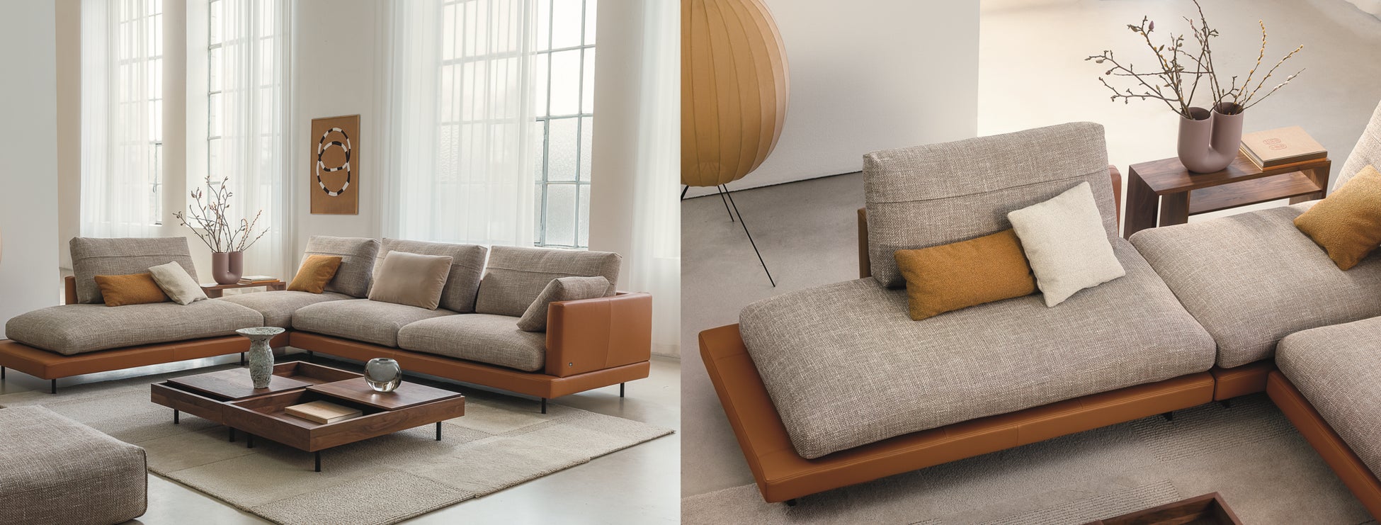 「SINA」はアラビア語で「美」を意味しており、ドイツのクラフツマンシップを随所に感じる精巧なディテールが施されています。最大の魅力は、お好みのパーツを組み合わせ、空間の自由度を高めるモジュール性です。パーツは27種類を取り揃え、ベースのフレームおよびクッションの張地は、ファブリック約200種・レザー約80種と豊富なバリエーションからお選びいただけます。さらに座面の奥行きや高さ、背クッションの仕様、脚部の色などに至るまで、さまざまなオプションがあり、ライフスタイルや様々なシーンにあわせたカスタマイズが可能です。