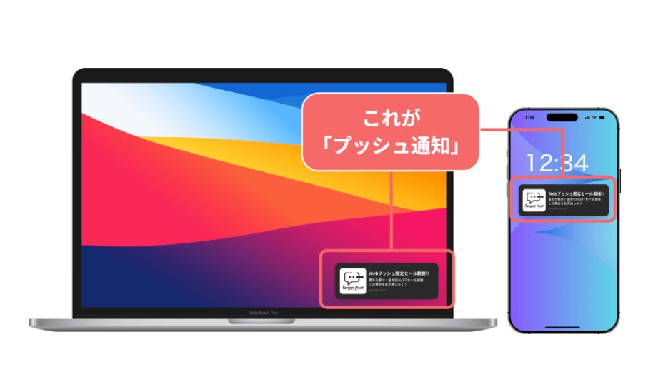 「EC-CUBE TargetPush」は、ユーザーのPCやスマートフォンの画面上に直接メッセージを表示できます。本サービスは、新規顧客や既存顧客といったユーザーの行動や状況にあわせたターゲティング配信や、成果可視化による通知の最適化、そしてこれらの機能がアプリの開発なしですぐに利用できる点が特徴です。ユーザーがWebブラウザ上で「通知許可」をすれば継続的なコンタクトが可能になるため、リターゲティング広告やメールマガジンなどに代わる手段として、Webサイトへの再来訪やコンバージョン促進が期待できます。