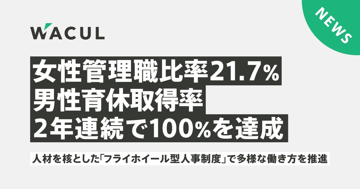 データと知⾒を核に、戦略から実⾏までマーケティングDXを⼀気通貫で⽀援する株式会社WACUL(本社:東京都千代⽥区、代表取締役社⻑:⼤淵 亮平、証券コード:4173、読み:ワカル、以下当社)は、多様で柔軟な働き方の推進を通じて、女性管理職比率が21.7%へ上昇、男性育休取得率が2年連続で100%を達成したことをお知らせします。