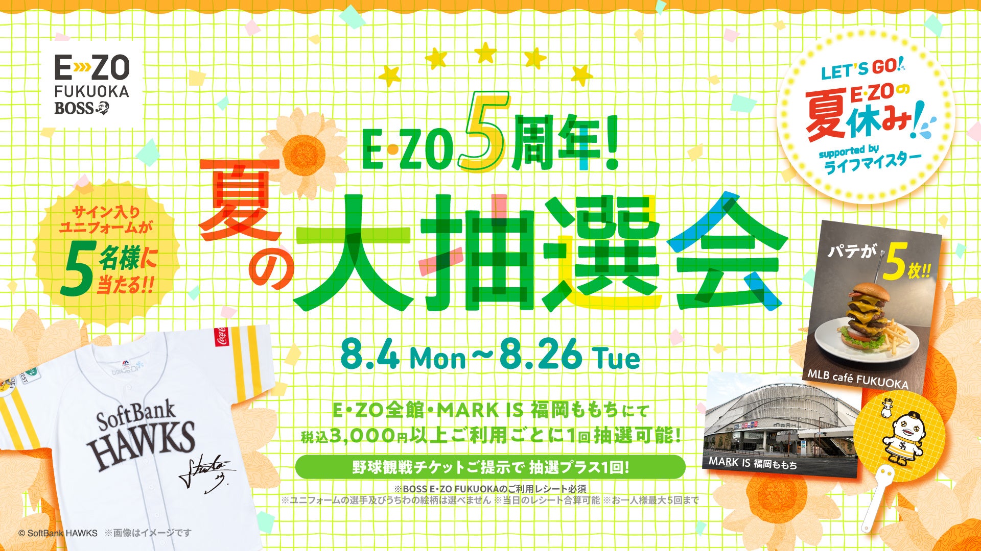 あなた自身のE・ZOに関する思い出やエピソード、E・ZOで遊んでみたいアトラクション、やってみたいことを書いていただき、その投稿の最後に「#わたしのEZO」「#EZO5周年」を付けて投稿いただいた方の中から抽選で、7月21日(月・祝)のBOSS E・ZO FUKUOKA 5周年記念セレモニーへご招待します!