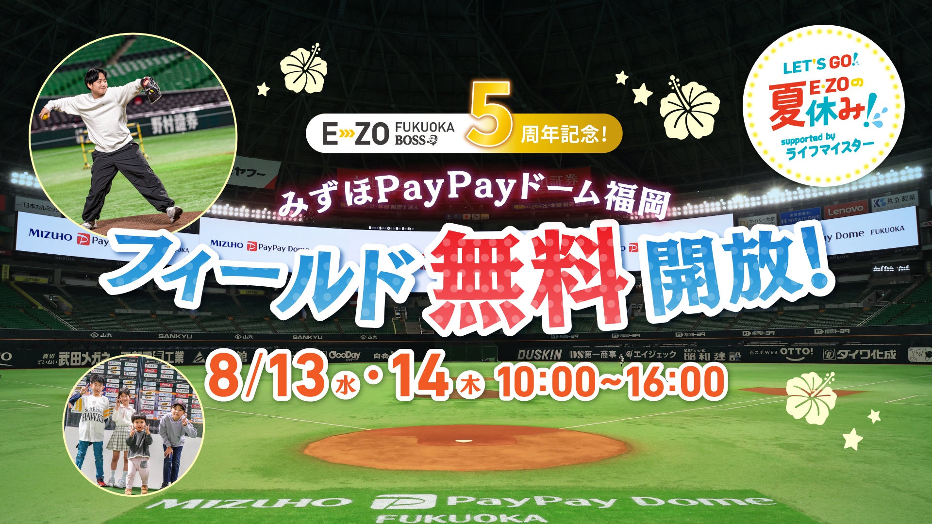 8月13日(水)と14日(木)の2日間は、みずほPayPayドームのフィールドを無料開放します!普段なかなか入ることができないフィールドでキャッチボールや写真撮影などをお楽しみいただけます♪さらに当日のBOSS E・ZO FUKUOKA 4F「王貞治ベースボールミュージアム」 チケットのご提示で「内野エリア」への入場も可能に!