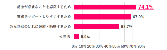 Q.2で「教えてほしい」と答えた人にその理由を聞いてみると、「配慮が必要なことを認識するため」74.1%が1位となりました。次いで「業務をサポートしやすくするため」67.9%、「急な勤怠の乱れに理解・納得するため」53.7%と続いています。その他のコメントとしては「会話に気をつけたい」「以前不妊治療をしていたので、不安を聞いてあげたい」など、精神面でサポートをしたいという声が目立ちました。