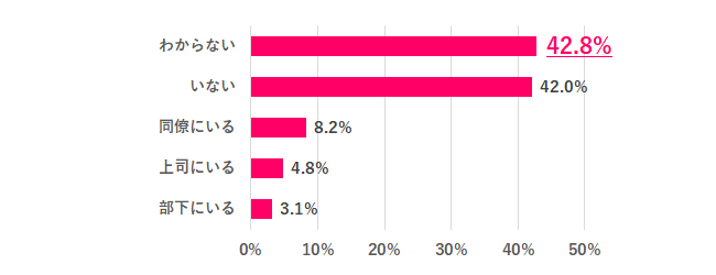『女の転職type』会員に職場に不妊治療をしながら働いている人がいるかを聞いてみたところ、42.8%の人が「わからない」と回答しました。続いて「いない」と答えた人も42.0%にのぼり、不妊治療をしている人が身近にいることを把握している人は2割未満となりました。