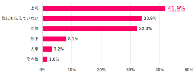 Q.7で不妊治療の経験が「ある」と答えた人に、職場の誰かに伝えたかを聞いたところ、1位は「上司」41.9%で、2位「誰にも伝えていない」33.9%、3位は「同僚」32.3%と続きました。1/3の人が誰にも伝えずに治療に臨んでいることがわかります。