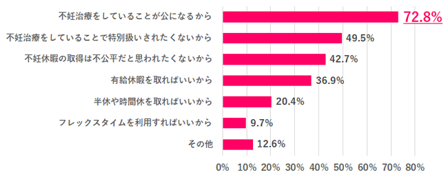 Q.5で職場に不妊休暇制度があっても「取りたくない」と答えた人に、その理由を聞いてみると「不妊治療をしていることが公になるから」72.8%が圧倒的に多い結果となりました。次いで「不妊治療をしていることで特別扱いされたくないから」49.5%、「不妊休暇の取得は不公平だと思われたくないから」42.7%が続いており、周囲の目を気にして控えようとする人が多いことがわかりました。