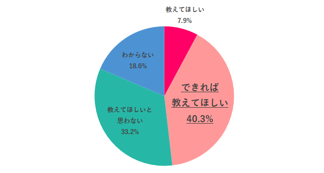 一方、「教えてほしいと思わない」も33.2%おり、「わからない」も18.6%という結果になりました。