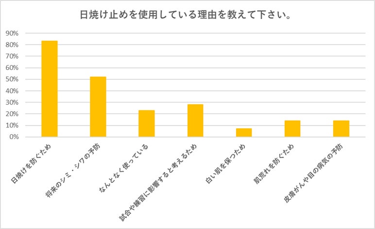 「将来のシミ・シワのリスクが増える」「パフォーマンスに影響が出る」といった紫外線ダメージによる影響について、チームメイトや引退された選手など周りの人からのアドバイスで、日焼け止めを使い始めた選手が多いようです。