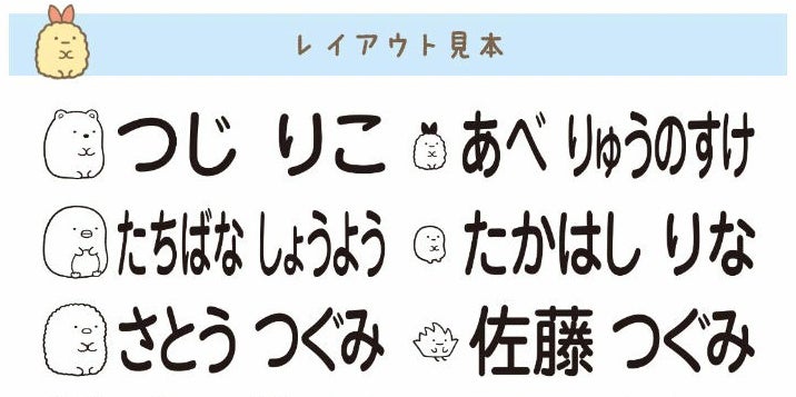 まだ文字を読めないお子さまにも、かわいいすみっコで自分のものがわかるメリットがありますが、お名前部分もお子さまの学びに配慮した学習フォントを採用。たとえばひらがなの「き」「さ」「り」のように間違った書き方をされやすい文字について、正しい書き方を覚えることに役立ちます。
