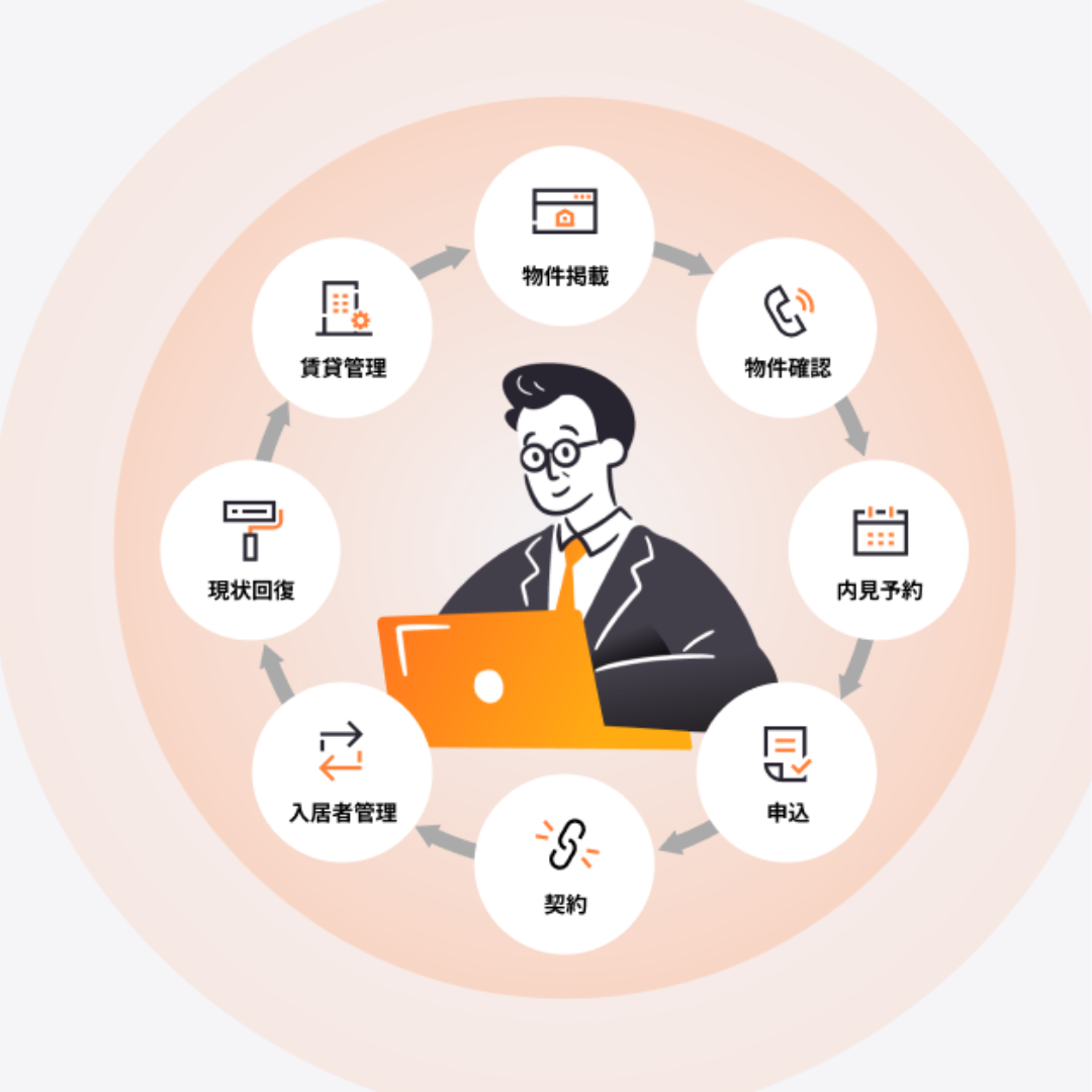 不動産賃貸管理会社向けの業務支援サービスです。物件検索から内見予約、入居申込、賃貸借契約、入居者管理、更新退去手続き、原状回復工事までの一連の業務をテクノロジーで支援し、業務効率化と顧客満足度向上を実現し、不動産業界のペーパーレス化に貢献しています。