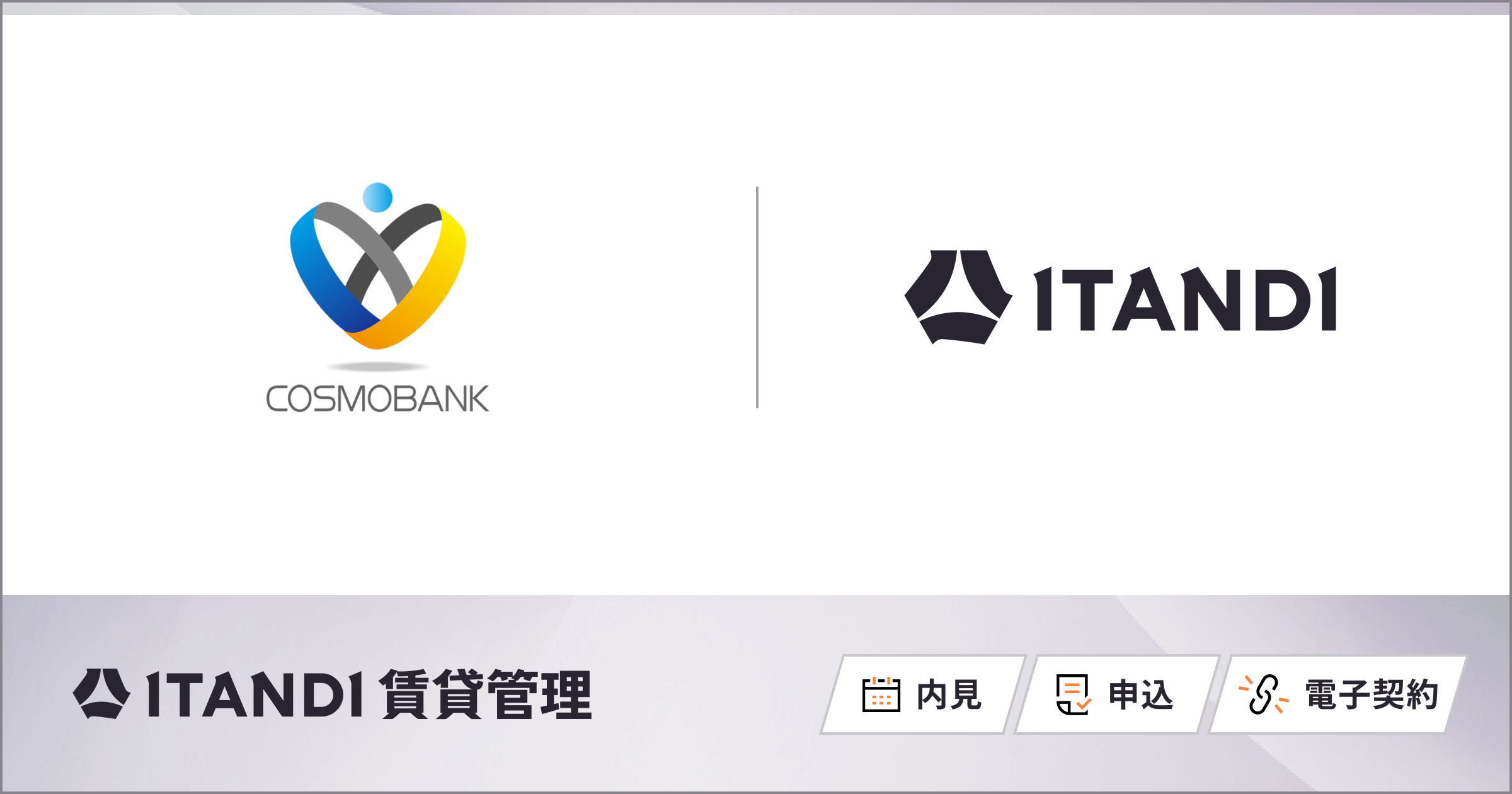 2026年3月よりコスモバンクは、3年連続で仲介会社の利用率No.1(※1)の「ITANDI 賃貸管理」を導入いたしました。内見予約、入居申込受付、電子契約のシステムをITANDIのサービスへ刷新するとともに、リアルタイム不動産業者間サイト「ITANDI BB」への物件掲載を開始しました。