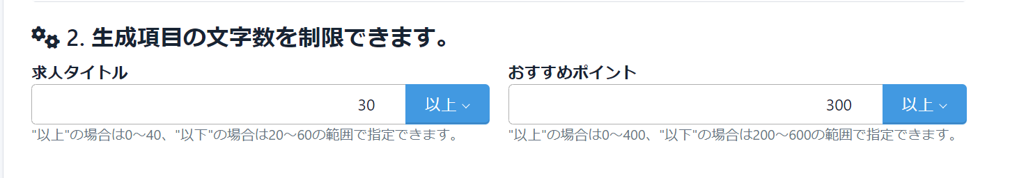 求人原稿を作成する際にタイトル・おすすめポイントを任意の文字数で生成出来る機能です。