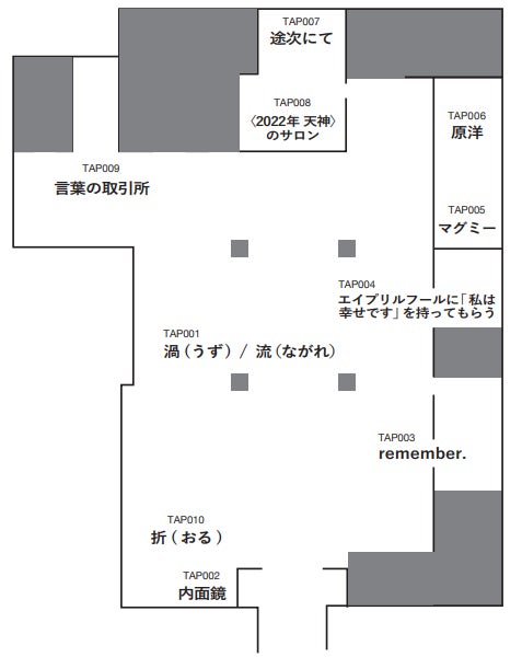 | TAP009 言葉の取引所 | 鑑賞者が持ち寄った⾔葉 (感情、思惑、テーマなど)を⼊⼒し、為替市場のような形で取引を行う。⾔葉や気持ちの循環及びコミュニケーションの促進を⽬指す。 |