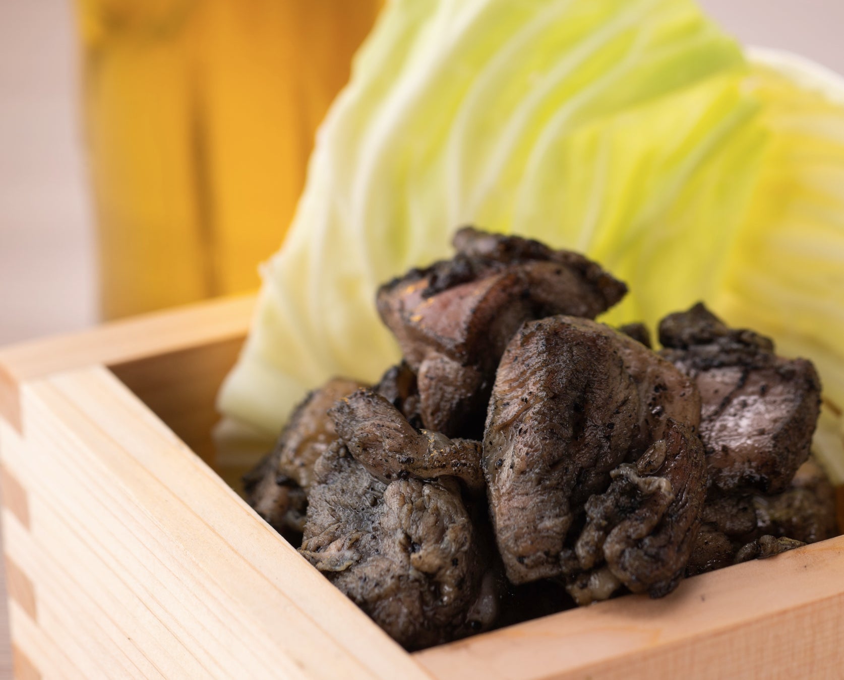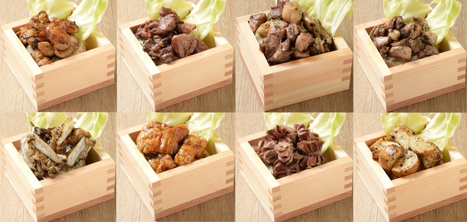 炭火に鶏油をかけながら豪快に焼き上げることで、炭の色や香りを纏います。枡(マス)に温めた鉄を入れ、その上に商品を乗せて提供するのでアツアツの状態で楽しめます