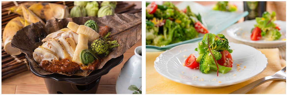 右:見た目にも春らしい「春野菜の和え物 パルメザン風味」は、一度お浸しにした春野菜をパルメザンチーズ、オリーブオイル、レモン汁で風味付けした爽やかな味わいが魅力。女性にお薦めの一品です。