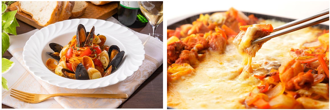 左:但馬産ねぎを使ったペスカトーレロッソ。魚介の旨味を効いたトマトソースと優しい甘さのねぎをパスタに絡めてご提供いたします。