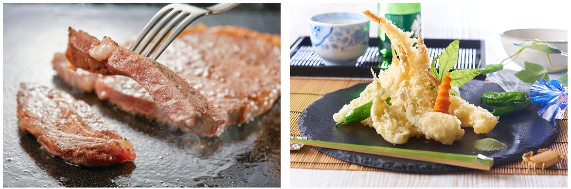 写真:ライブキッチンから出来立てをご提供する人気メニュー「サーロインステーキ」と「季節の天ぷら」。出来立ての美味しさだけでなく、音や香り、活気溢れる調理風景もお楽しみください。