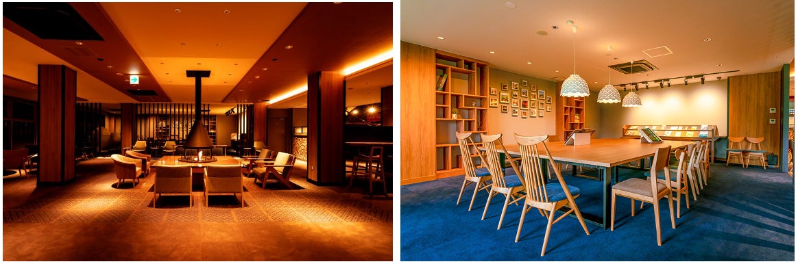 左:プレミアムラウンジのドリンクカウンターの上や、ライブラリー、テーブル上のライトカバーは豊岡市出石町で作られる磁器「出石焼」を使用。透き通るように白い滋肌に浮彫りや透かし彫りの精緻な紋様が施された味わいのある作品をお見逃しなく。