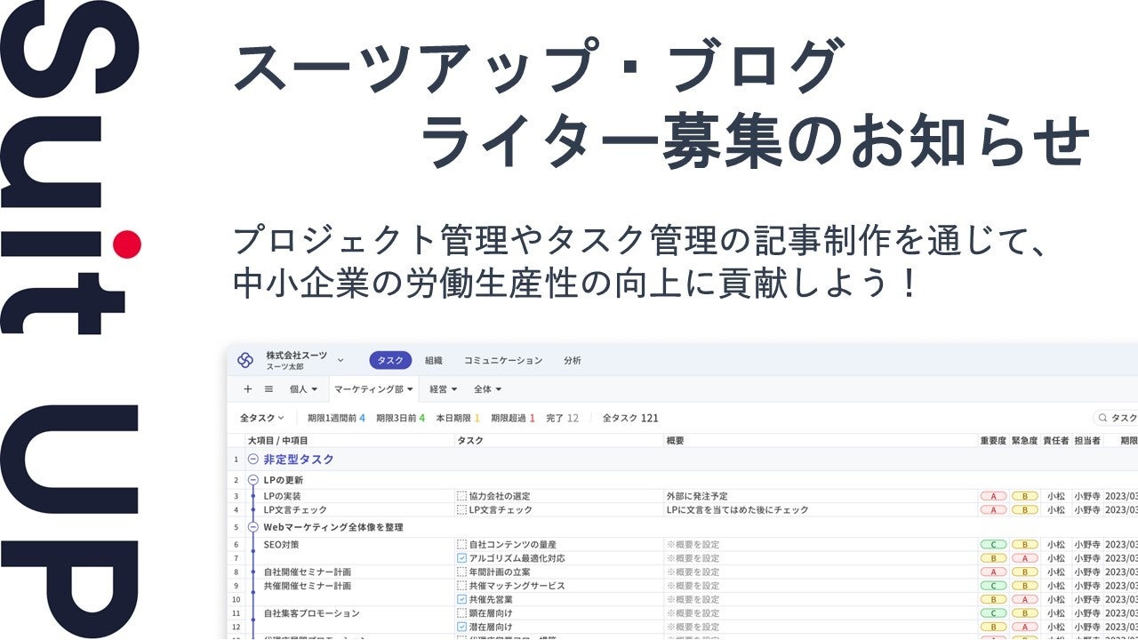 株式会社スーツ(所在地:東京都千代田区、代表取締役社長CEO:小松 裕介)は、チームのタスク管理・プロジェクト管理ツール「スーツアップ」のスーツアップ・ブログにおいて、2025年7月にブログを書いてくれるボランティア・ライターを募集します。