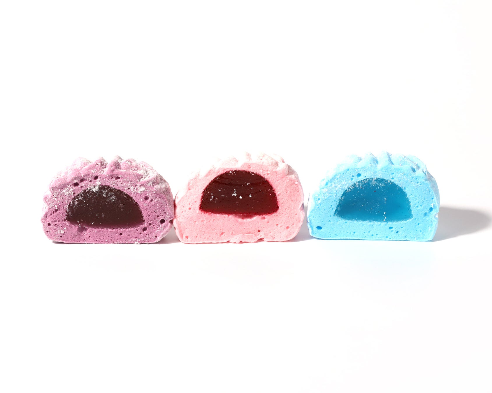 オンラインストア限定の、マシュマロとキャンディパーツがセットになった、自分でモンスターを作り上げるワクワク商品です。モンスターの脳みそをイメージした水色のヨーグルトマシュマロの中には、切ってびっくりの果汁入りのグレープマシュマロが入った2層構造です。見た目がおどろおどろしくなるよう、ドライブルーベリーを混ぜ込み、最後までより美味しくお召し上がりいただけるよう仕上げました。キャンディは目玉と唇、ツノのパーツ付き。みんなで楽しめるパーティーの主役アイテムとして、オリジナルモンスターを作ることができます。