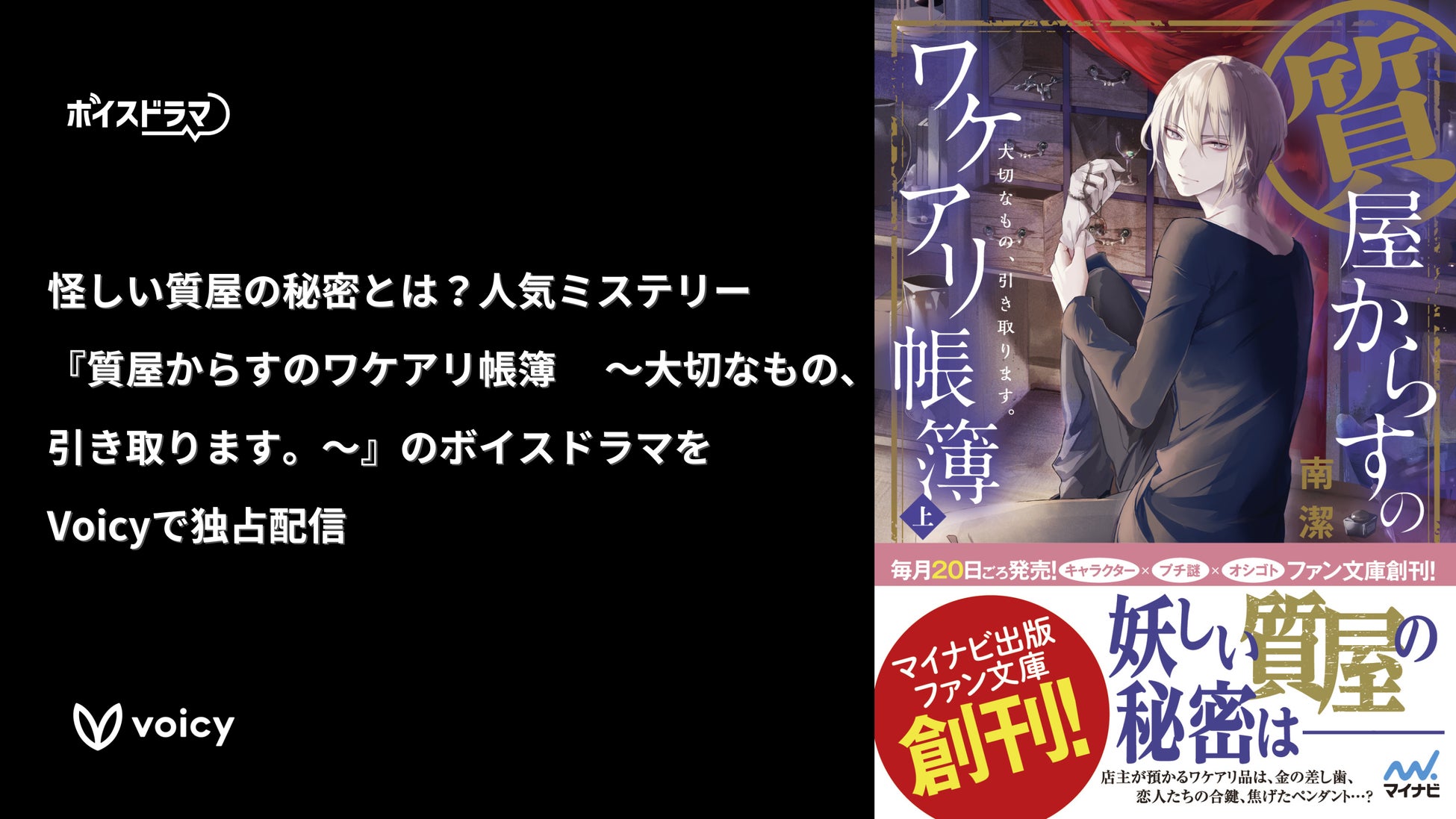 株式会社Voicyが運営する音声プラットフォームVoicyは、1月20日(月)より、マイナビ出版ファン文庫の人気作品『質屋からすのワケアリ帳簿 〜大切なもの、引き取ります。〜』のボイスドラマを配信開始します。