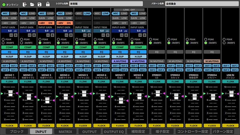 『MX-D1606』は、音量バランスの確認や、トラブル対処が即座に可能な60mmの入出力フェーダー、入出力のルーティングが一目で確認可能なLEDを装備。最大16種類のプリセットを本体に記憶でき、メモリーボタンに登録した4パターンから運用に合わせた音響システムに素早く切り替え可能です。