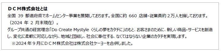 全国でホームセンター事業を展開するDCM株式会社(本社:東京都品川区、代表取締役社長:石黒靖規)は、DCM美沢店(愛媛県松山市を2月8日(土)にリニューアルオープンしますので、ここにお知らせいたします。