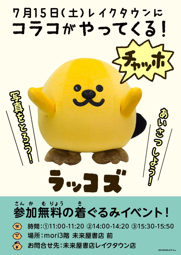 未来屋書店レイクタウン店にて、主人公「コラコ」が登場するフリーグリーティングイベントを開催します。当日はどなたでも「コラコ」との写真撮影やごあいさつができるほか、作者・たかだべあのサイン入り絵本『チャッホ!』も数量限定(無くなり次第終了)で販売いたします。