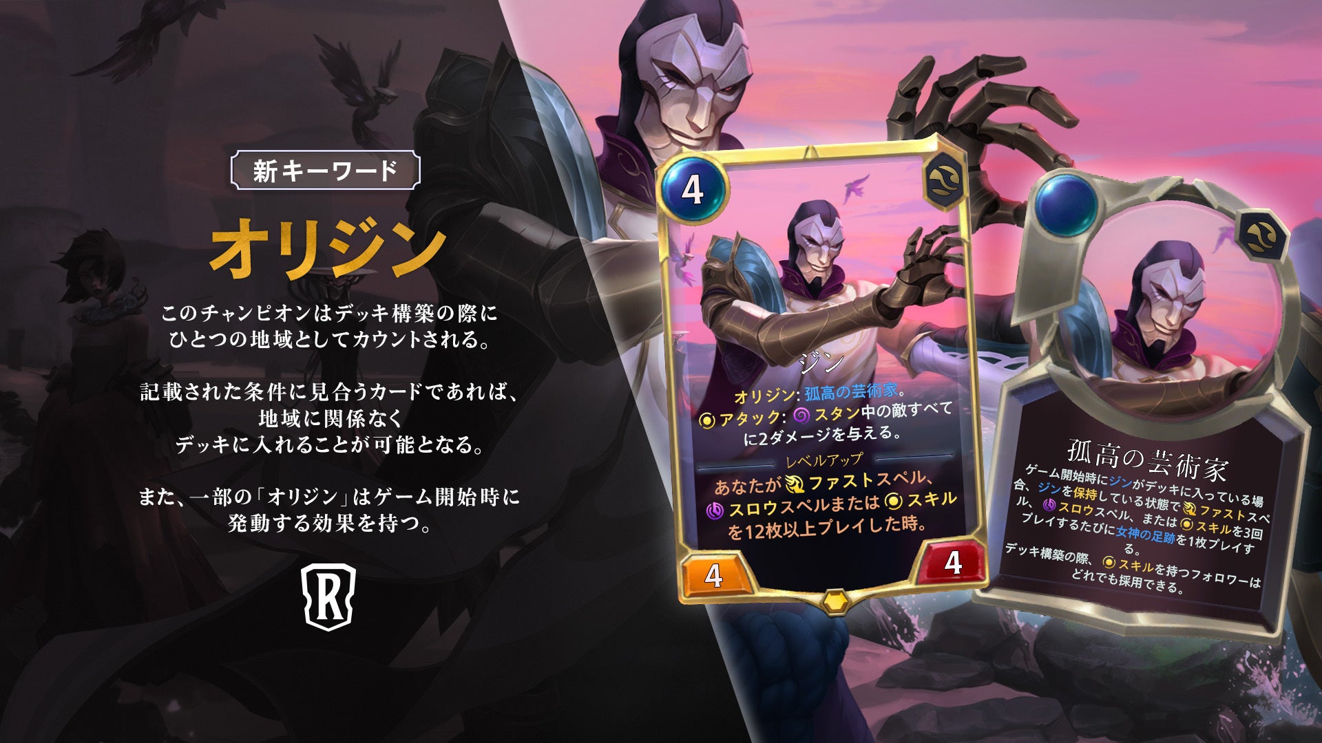 ジンはLoR史上初のルーンテラ チャンピオンです。オリジンは「孤高の芸術家」で、これによりプレイヤーはスキルありのカードであればデッキに加えることができます。