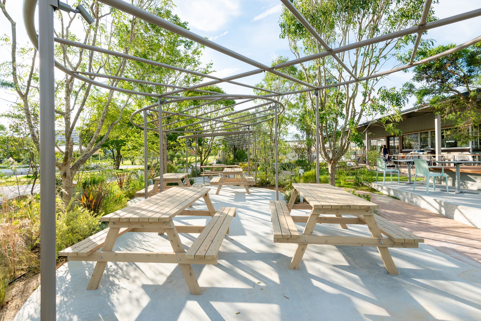 ガラス貼りで明るい店内席や、100席以上ある広々とした野外席にて、公園の緑を楽しみながら4種のモーニングメニューをご堪能いただけます。