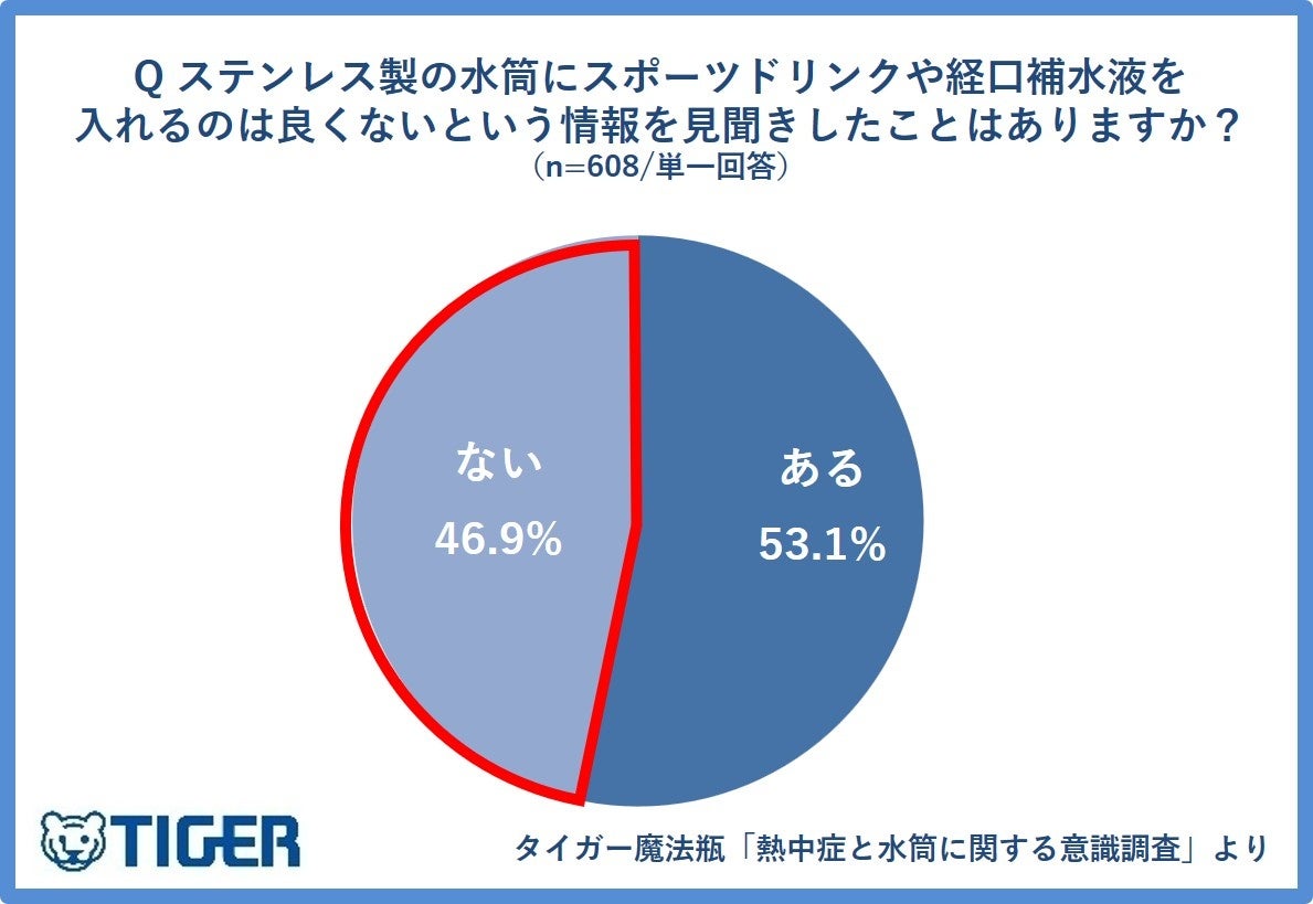 熱中症対策として広く利用されているスポーツドリンクや経口補水液ですが、塩分を含むため、サビや穴があくなど故障の原因になるおそれがあり、一般的な金属製の水筒に入れることは推奨されていない場合があると見聞きしたことがあるか、の問いに、約半数が(46.9%)が「ない」と回答しました。