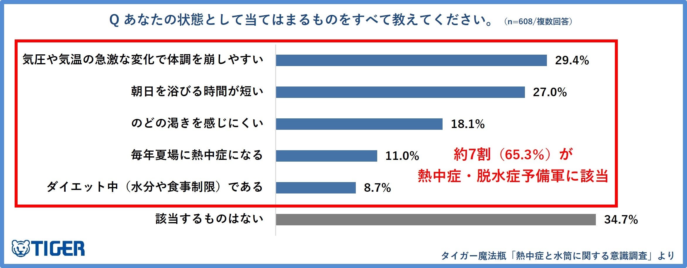 谷口医師によると、「気圧や気温で体調を崩しやすい」「喉の渇きを感じにくい」等といった症状を感じる人は熱中症・脱水症予備軍の危険性が高いと警鐘を鳴らします。本調査では約7割(65.3%)もの人が熱中症予備軍であることが判明しました。