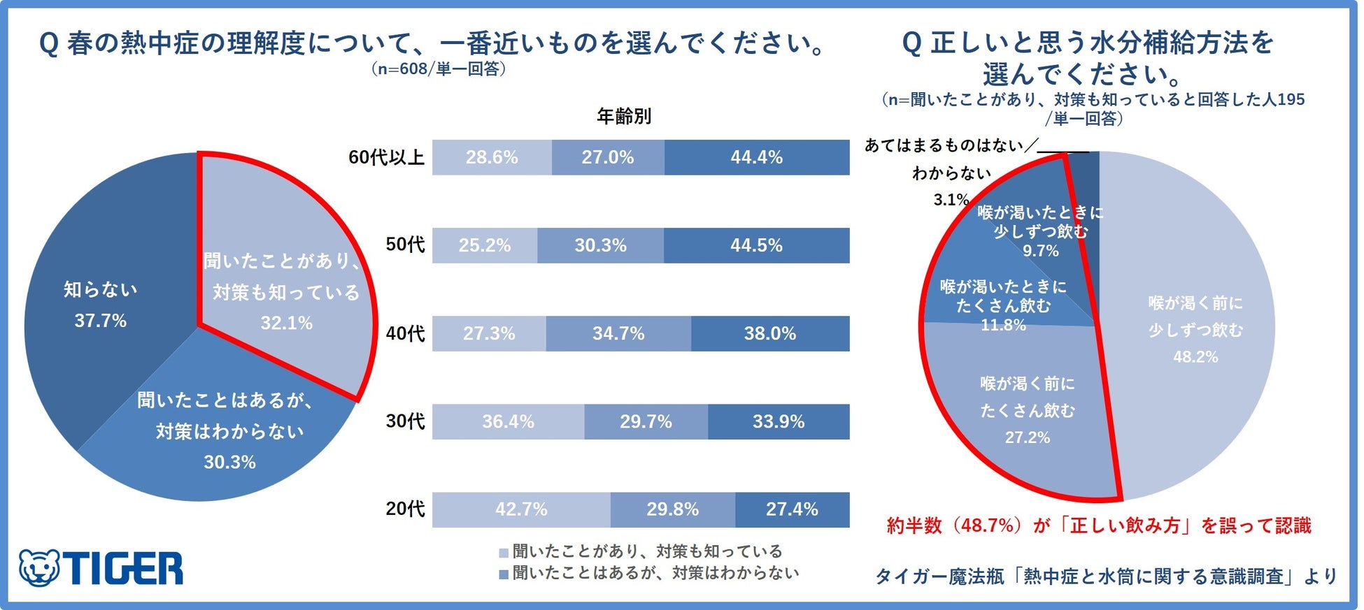 熱制御テクノロジーで世界をリードするタイガー魔法瓶株式会社(社長:菊池嘉聡、本社:大阪府門真市)は、2023年より継続して実施している「熱中症と水筒に関する意識調査」を、今年も全国の20代から60代の男女608人を対象に行いました。