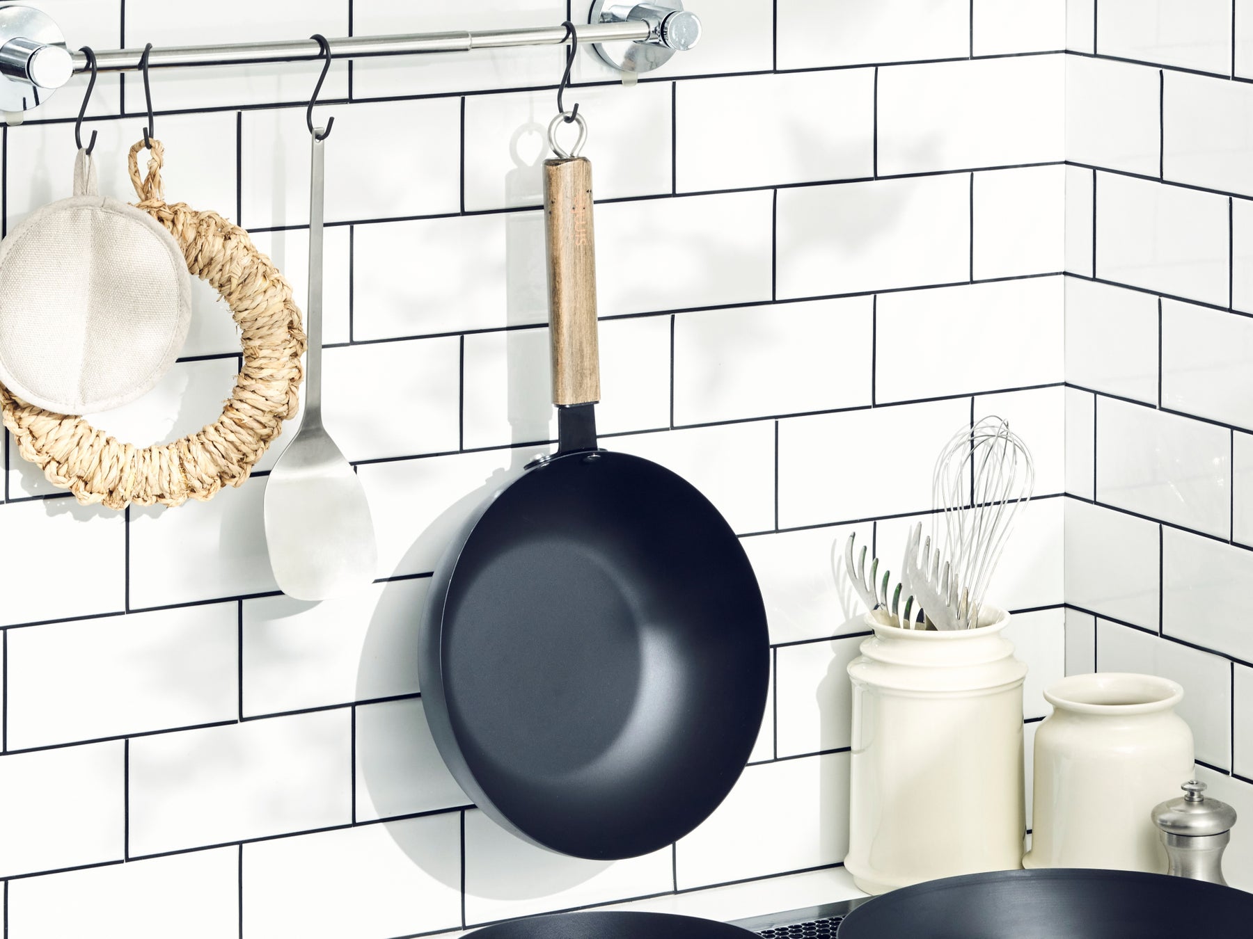ハンドルには天然木を採用しています。シンプルな鉄フライパンとの組み合わせが美しく、手にもなじみやすい仕上がりとなっています。ハンドルにはフックネジがついているため、壁掛け収納にも便利です。