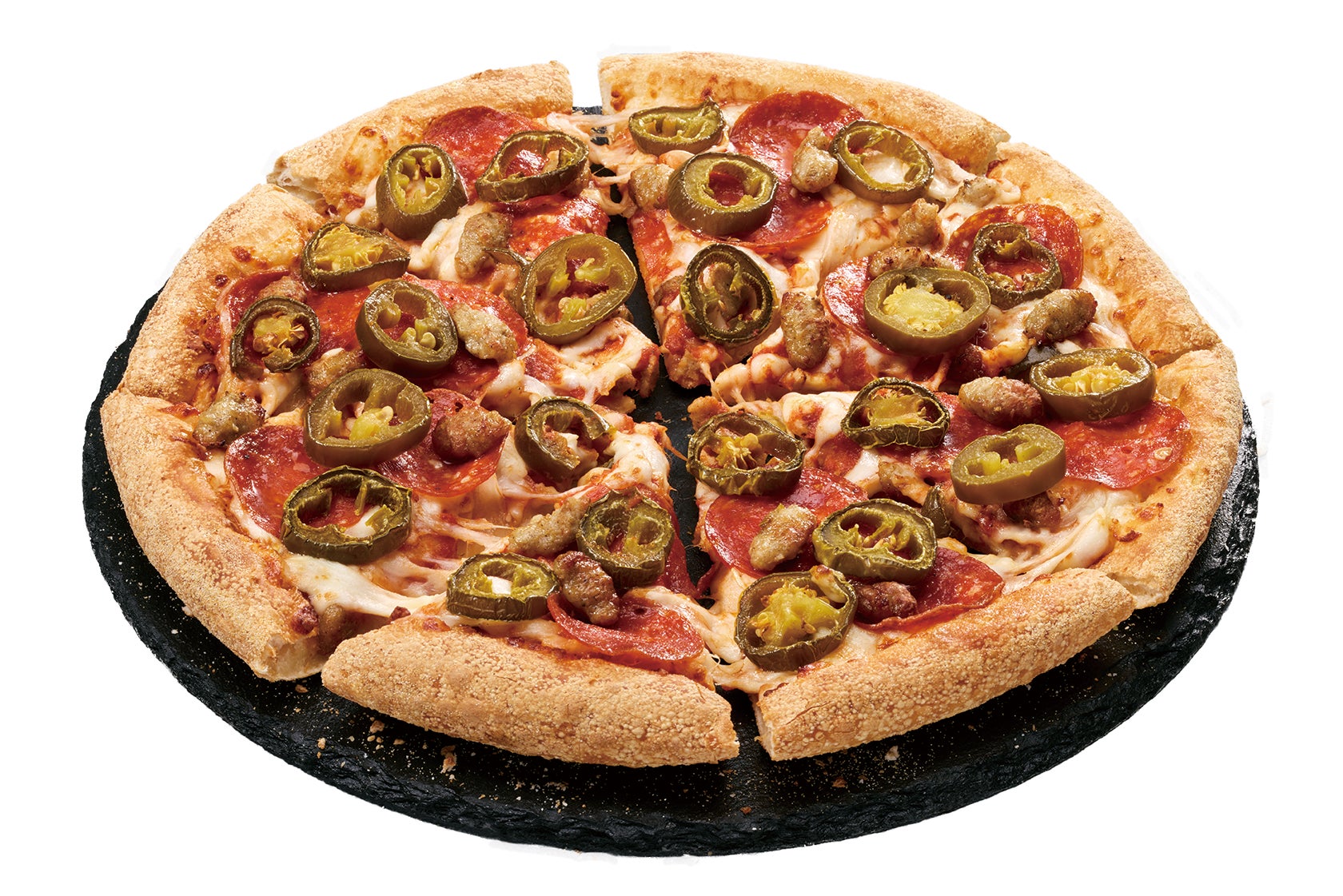 商品紹介:オニオン、ペパロニ、イタリアンソーセージの上に、酢漬けにしたハラピニオのスライスがたっぷり乗ったスパイシーは、本場メキシコ産のハラピニオを使用しています。お酒のおつまみにも合うと、大人に大人気です。