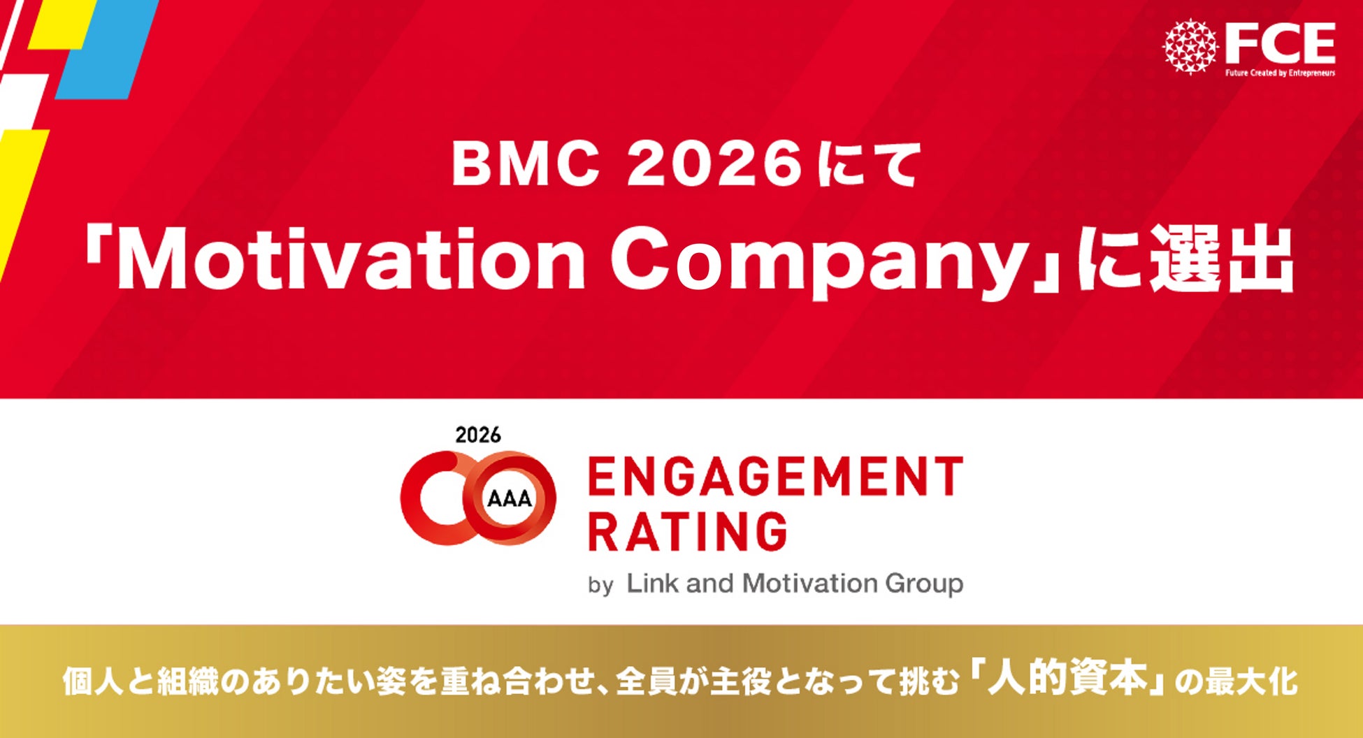 株式会社FCE(本社:東京都新宿区、代表取締役社長:石川淳悦、証券コード:9564)は、株式会社リンクアンドモチベーション(本社:東京都中央区、代表取締役会長:小笹 芳央、証券コード:2170、以下リンクアンドモチベーション)が発表した、「BMC2026(※1)」にて、従業員エンゲージメント(※2)が高い企業であるMotivation Companyに選出されました。