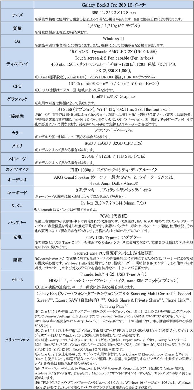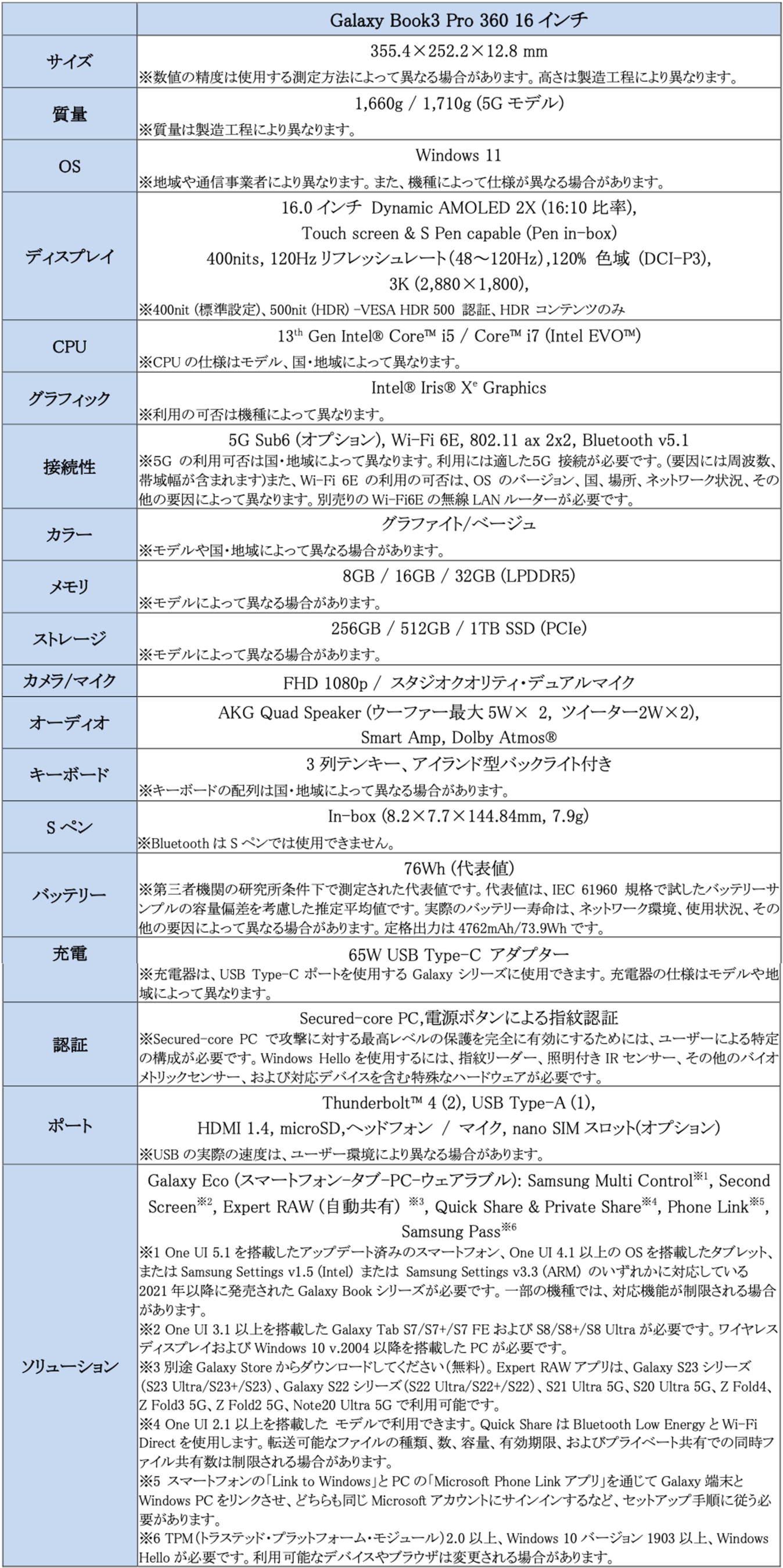 「Galaxy Book3 Ultra」では16インチのグラファイト、「Galaxy Book3 Pro」では14インチと16インチのグラファイトとベージュ2色展開※16となります。また、「Galaxy Book3 Pro 360」は、16インチ、5G接続オプション付き※17 、グラファイトとベージュ2色展開※18で提供されます。