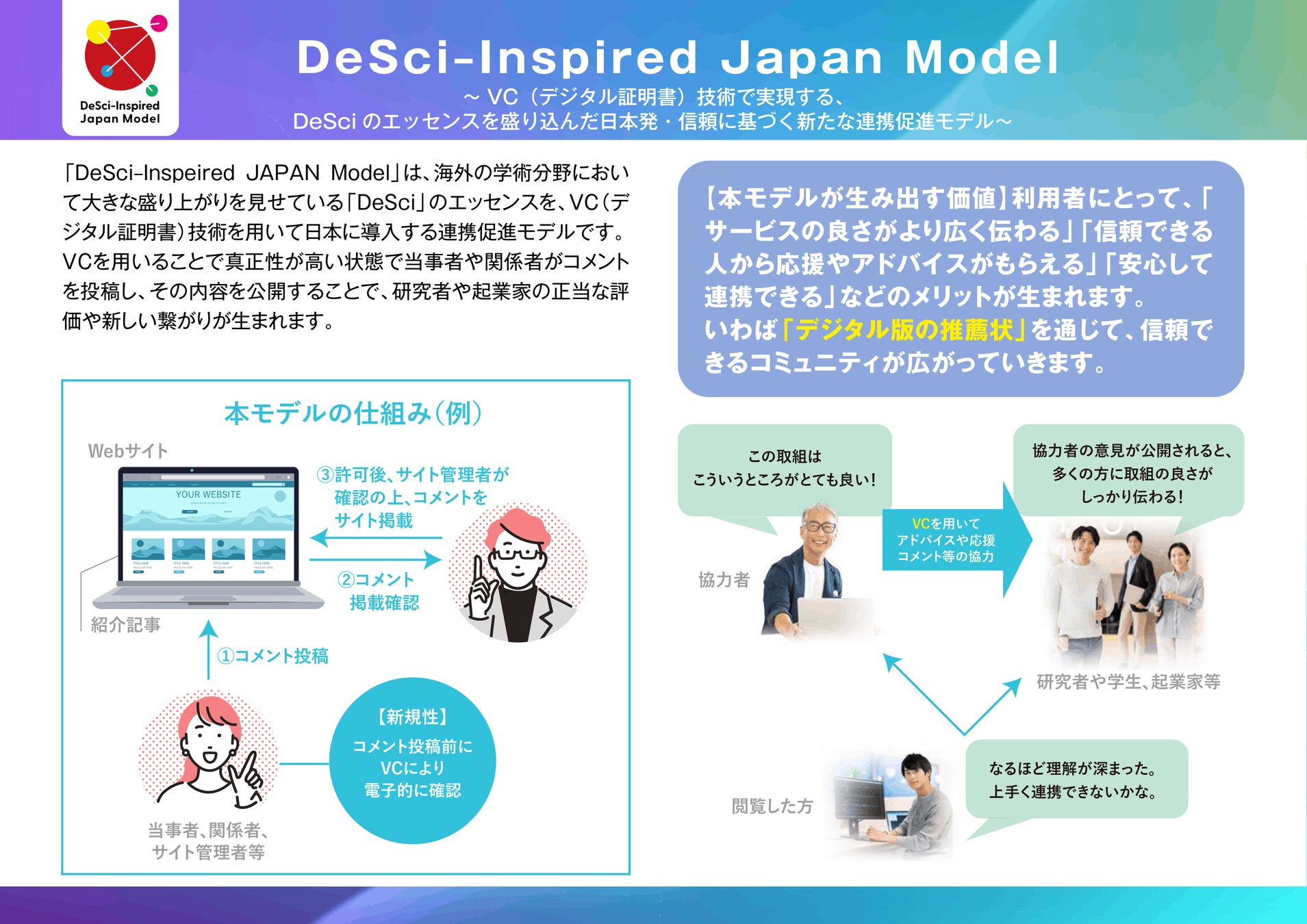 当社が提唱する「DeSci-Inspired Japan Model」は、海外の科学技術分野で注目されるDeSci(分散型サイエンス)の取り組みに着想を得つつ、次世代の分散型ID技術であるVC(Verifiable Credentials)技術に特化して日本における現実的な社会実装を実現するモデルです。