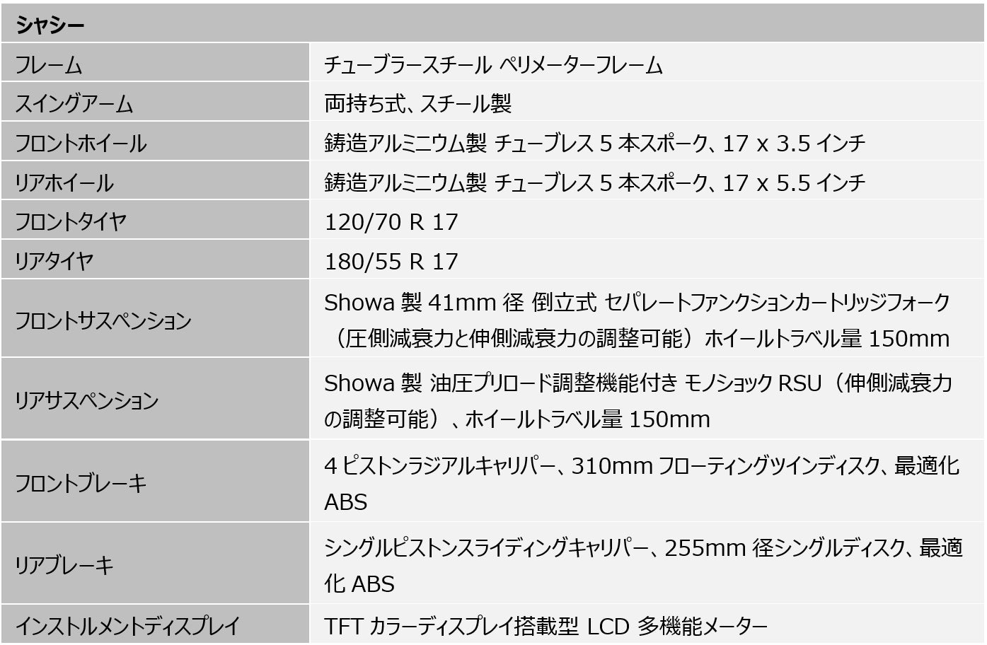よりライダーの快適性を向上させるため、オールLEDライト、Bluetooth接続によるターンバイターンナビゲーションと電話接続機能付きのTFTカラーディスプレイ搭載型LCD 多機能メーターも標準装備されています。