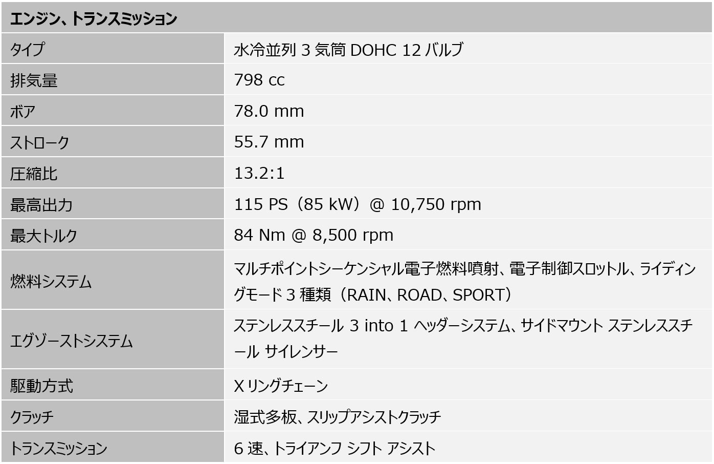 新型の798cc三気筒エンジンが生み出す115PSの最高出力と83Nmの最大トルク