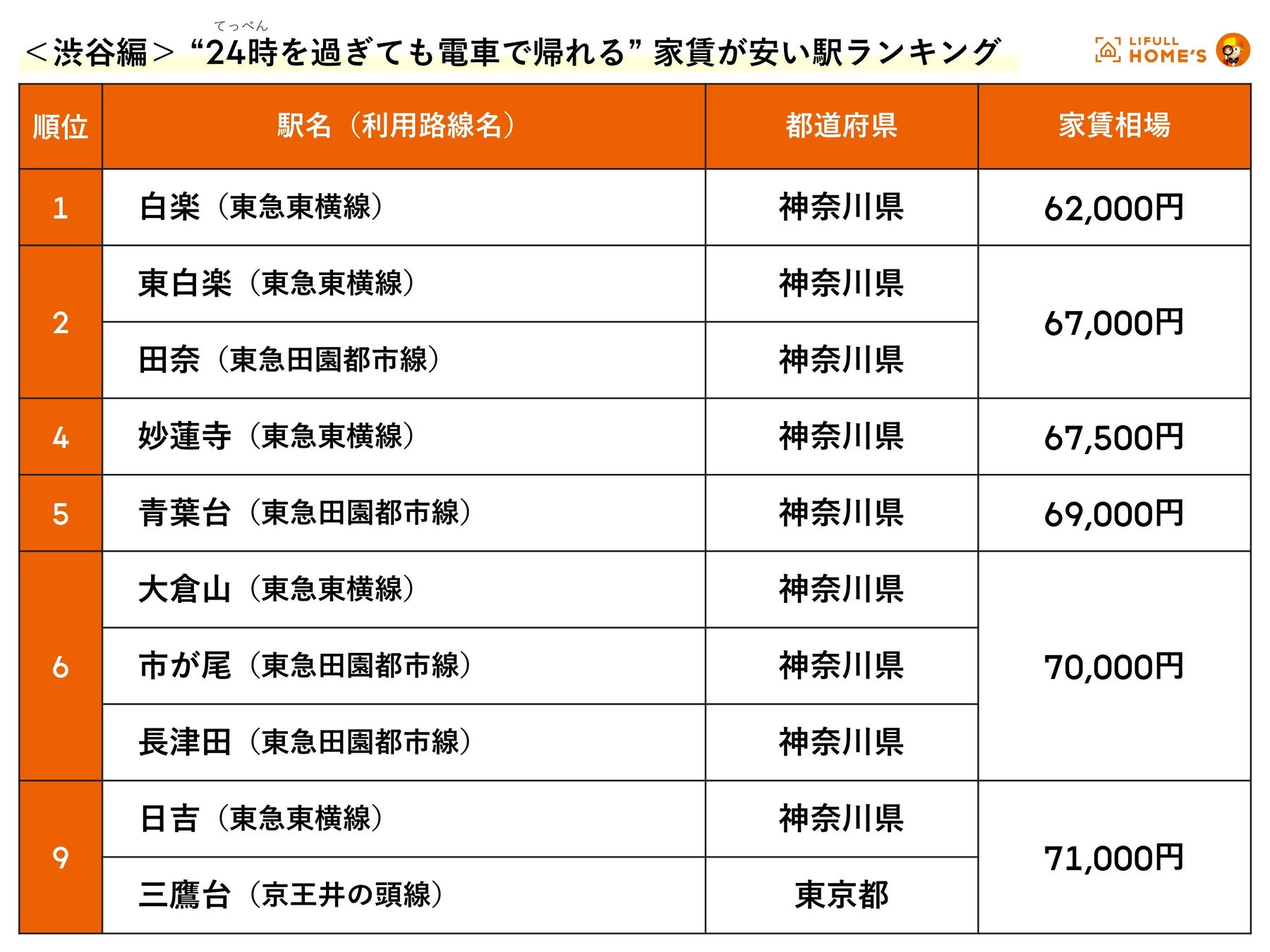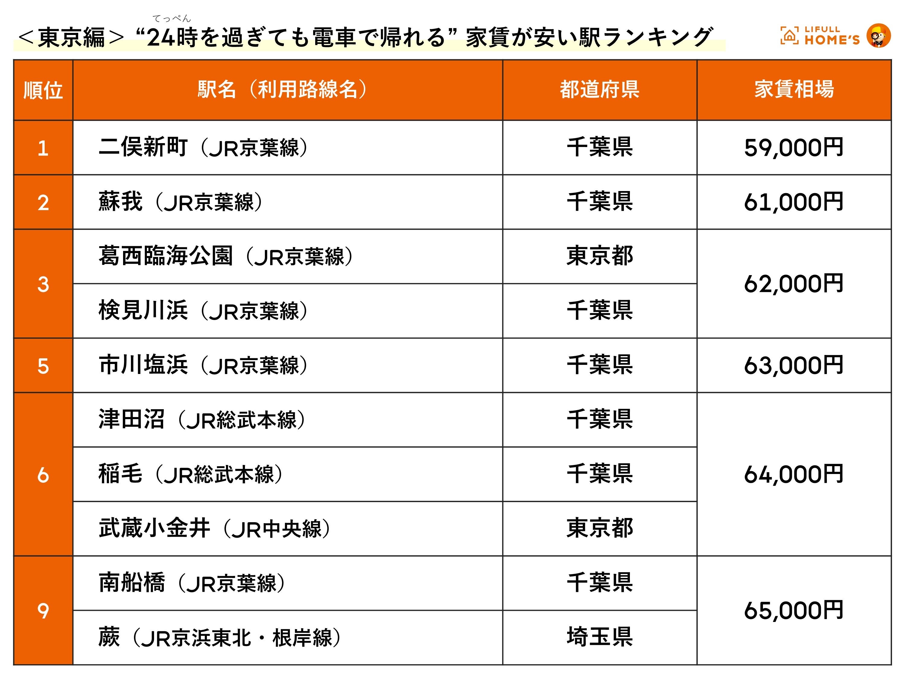 LIFULL HOME'S「“24時を過ぎても電車で帰れる” 家賃が安い駅ランキング」〜新宿・東京・渋谷・池袋編〜