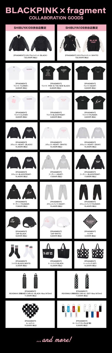 店舗では藤原ヒロシ氏が主宰するfragmentと「BLACKPINK」のコラボレーションアイテムを販売するほか、東京会場ではここでしか手に入らないSHIBUYA109限定アイテムも販売いたします。