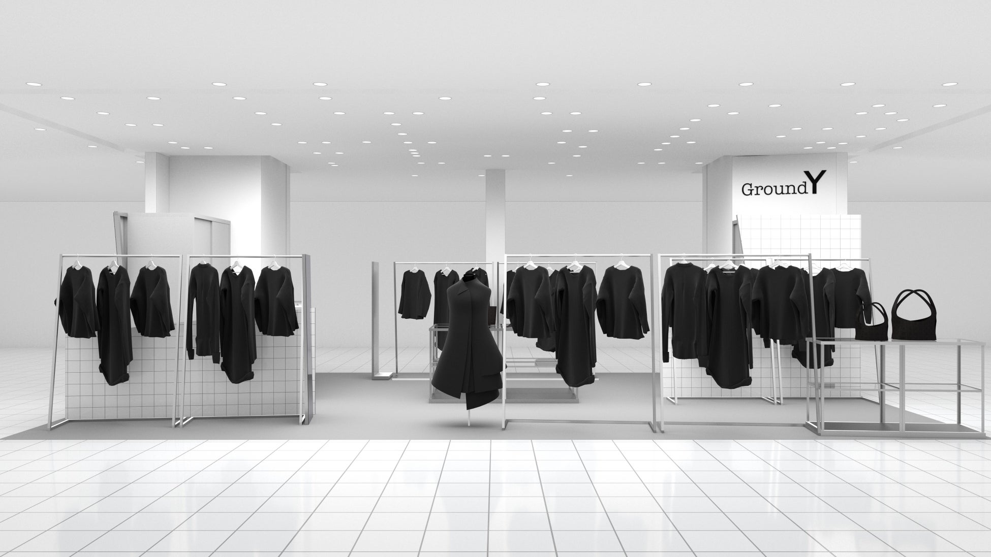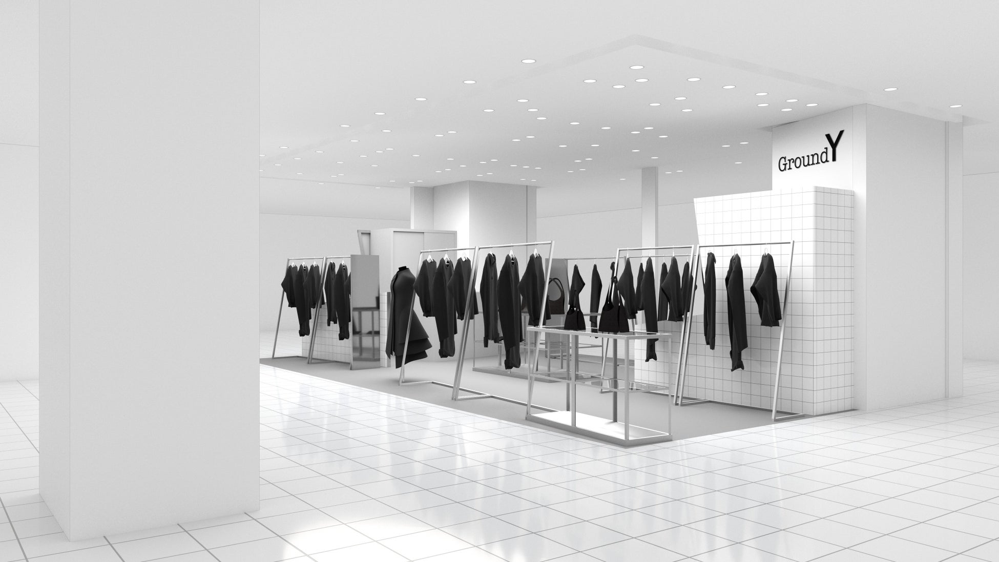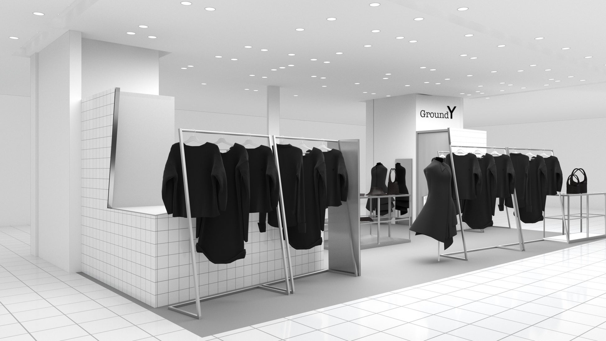 東海地区初出店となる名古屋PARCOの空間テーマは‟borderless“。壁の表面は白タイルで仕上げていますが、裏面は軽鉄骨を露出させるデザインを採用しました。壁を部分的に斜めに切り落とすことで、開放感のあるスペースとなっており、Ground Y独自の動きのあるアイテムを様々な角度から手に取っていただける距離感を意識したスペース作りが実現。壁の表裏の関係や、斜めに切ることで構造が剥き出しになっている事から、ヨウジヤマモト社ならではの服作りやGround Yのフィロソフィーを体現した店舗空間に仕上がっています。
