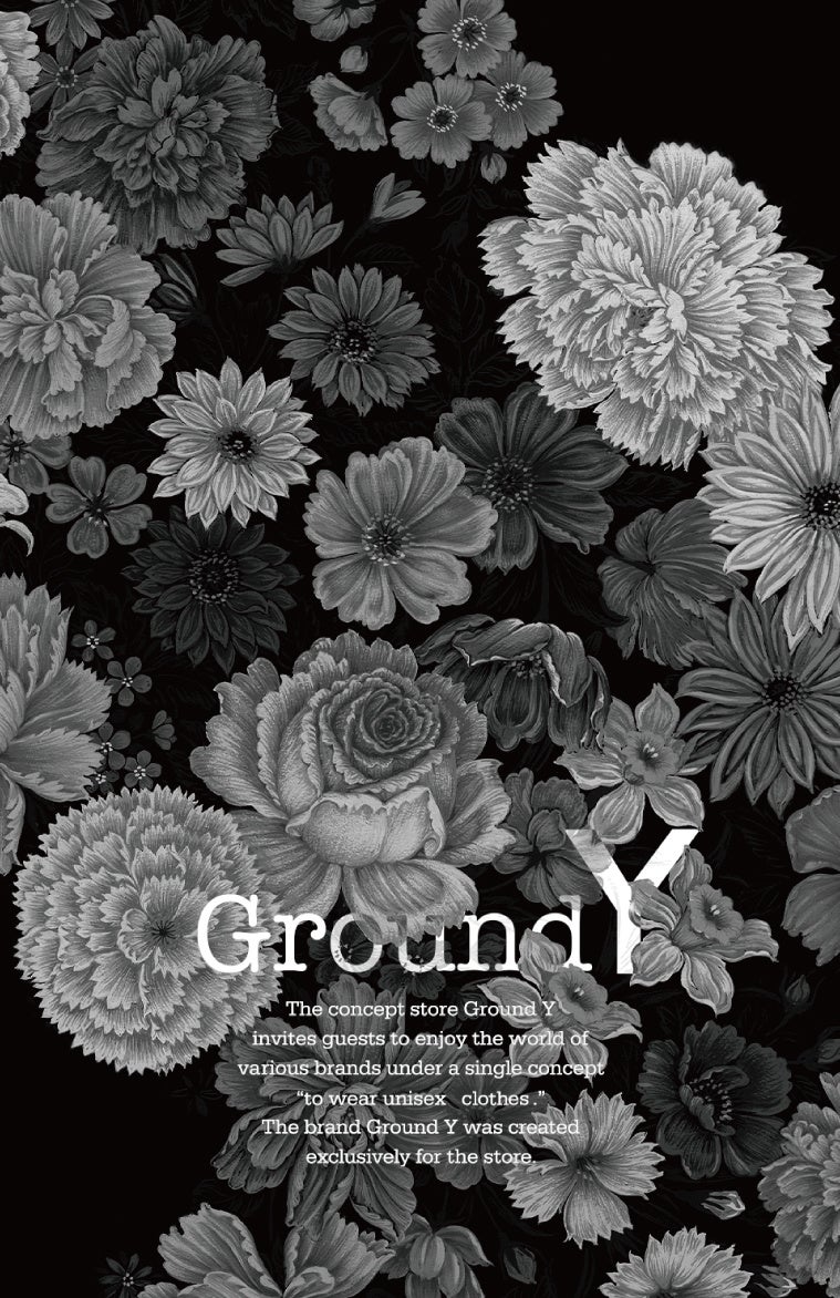 Ground Y の今シーズンのテーマは『百花繚乱』。ダークトーンに落とし込んだ数多の花柄は、Ground Yの持つアイデンティティと混ざり合う事で、華やかなだけでなく、より深く、荘厳さを持ち合わせたグラフィックへと昇華しています。「百花繚乱」の如く、多種多様なあり方やオリジナリティを表現するコレクションをご提案いたします。