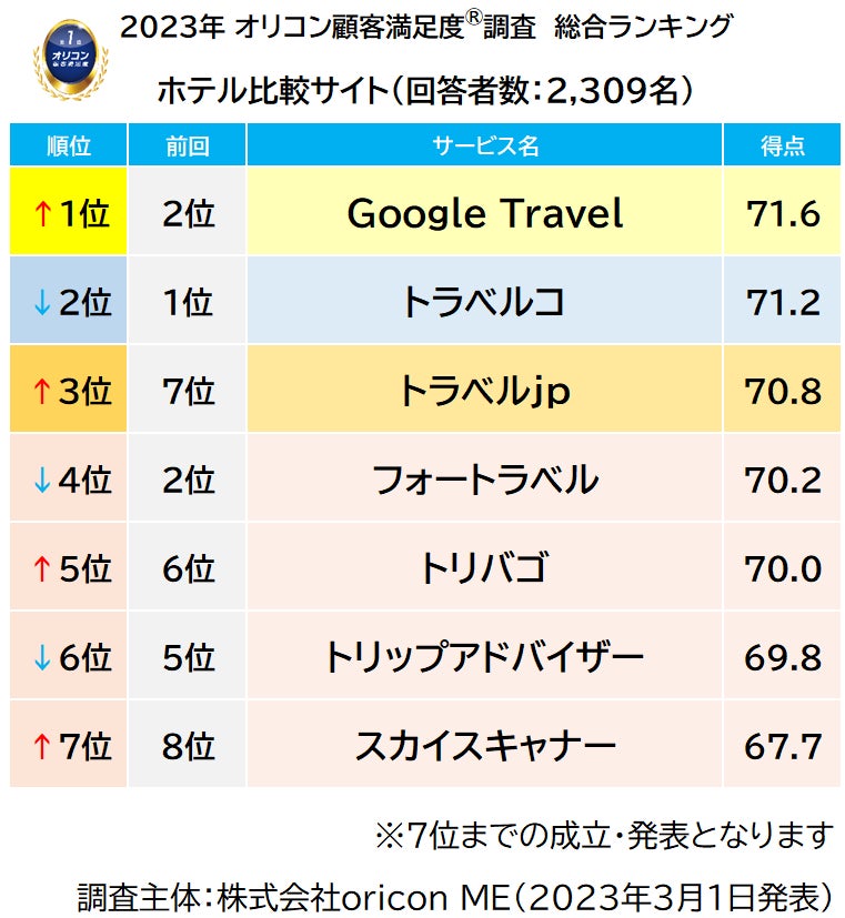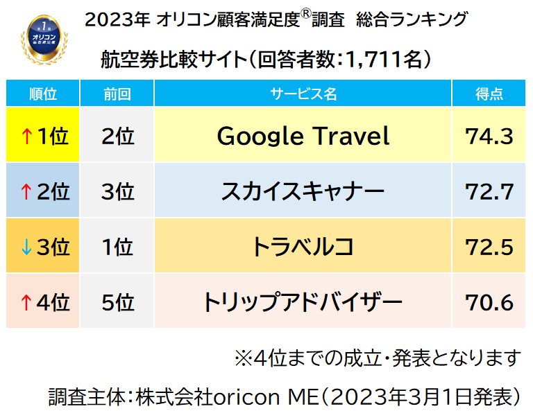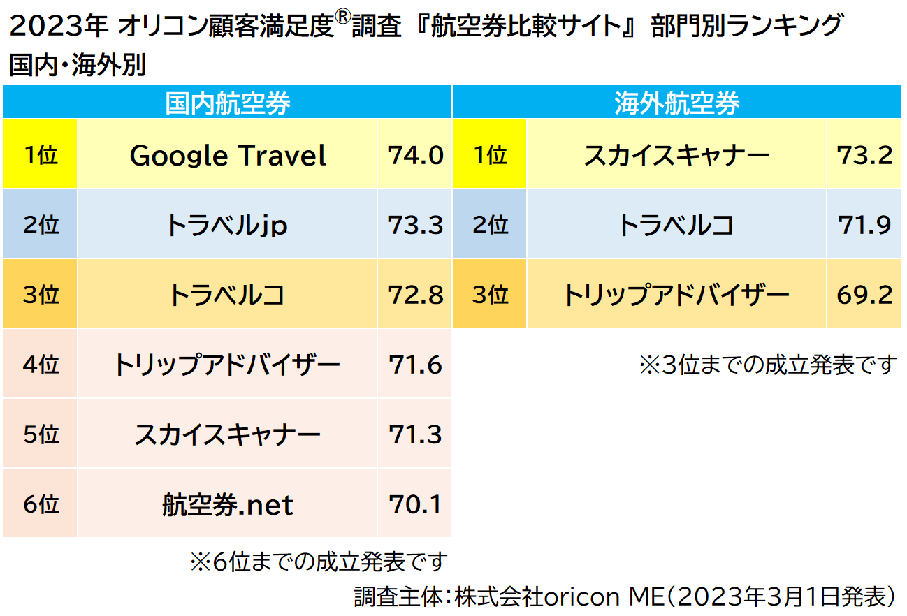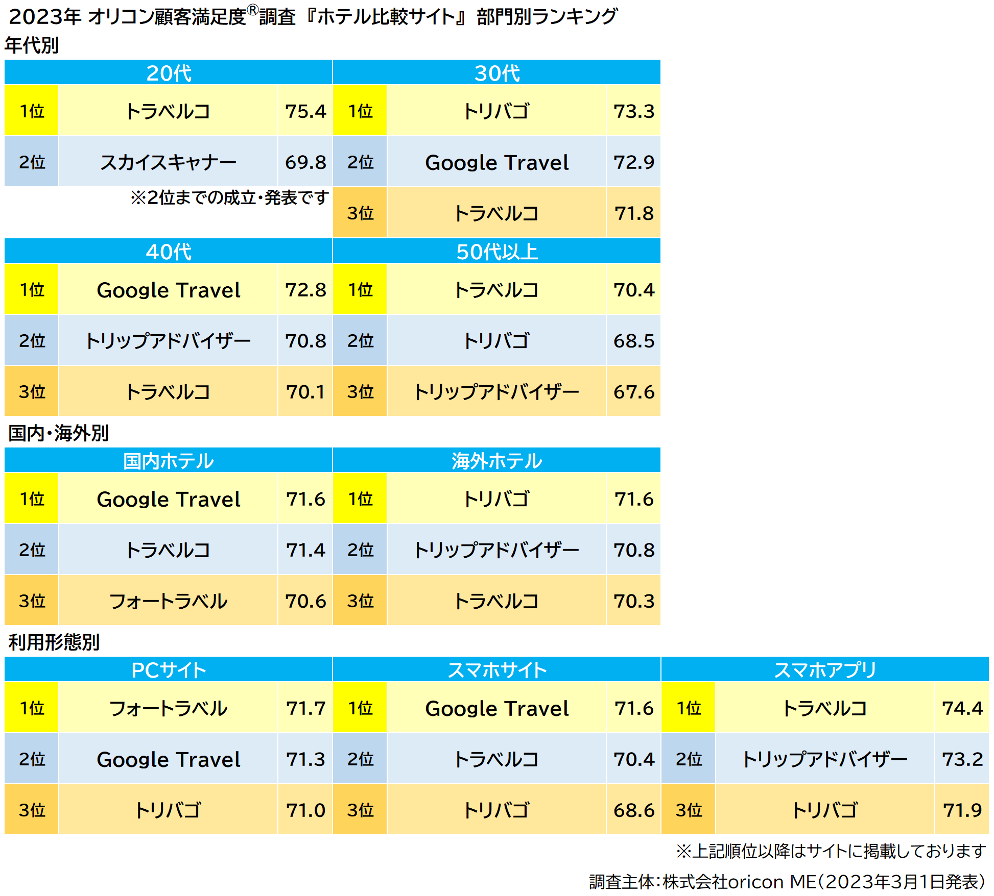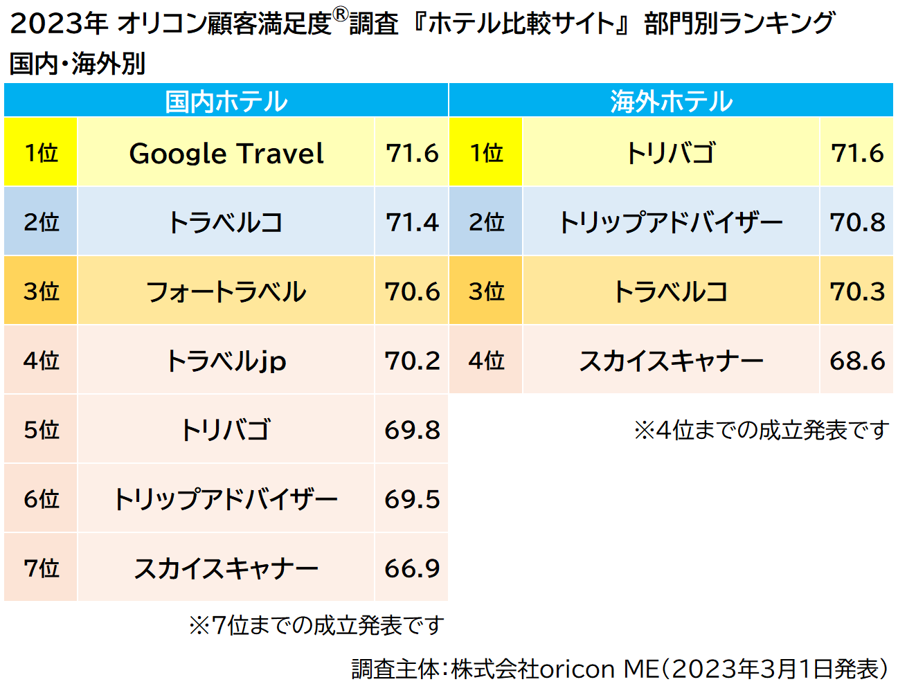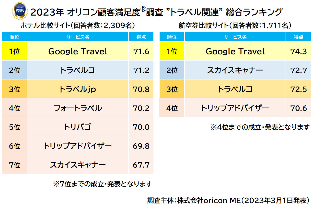 実際の利用者4,020名が評価した“トラベル”関連 『ホテル比較サイト』『航空券比較サイト』ランキング(2023年 オリコン顧客満足度®調査 )