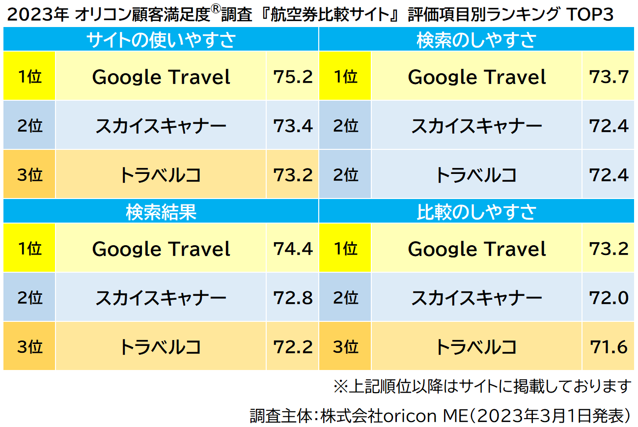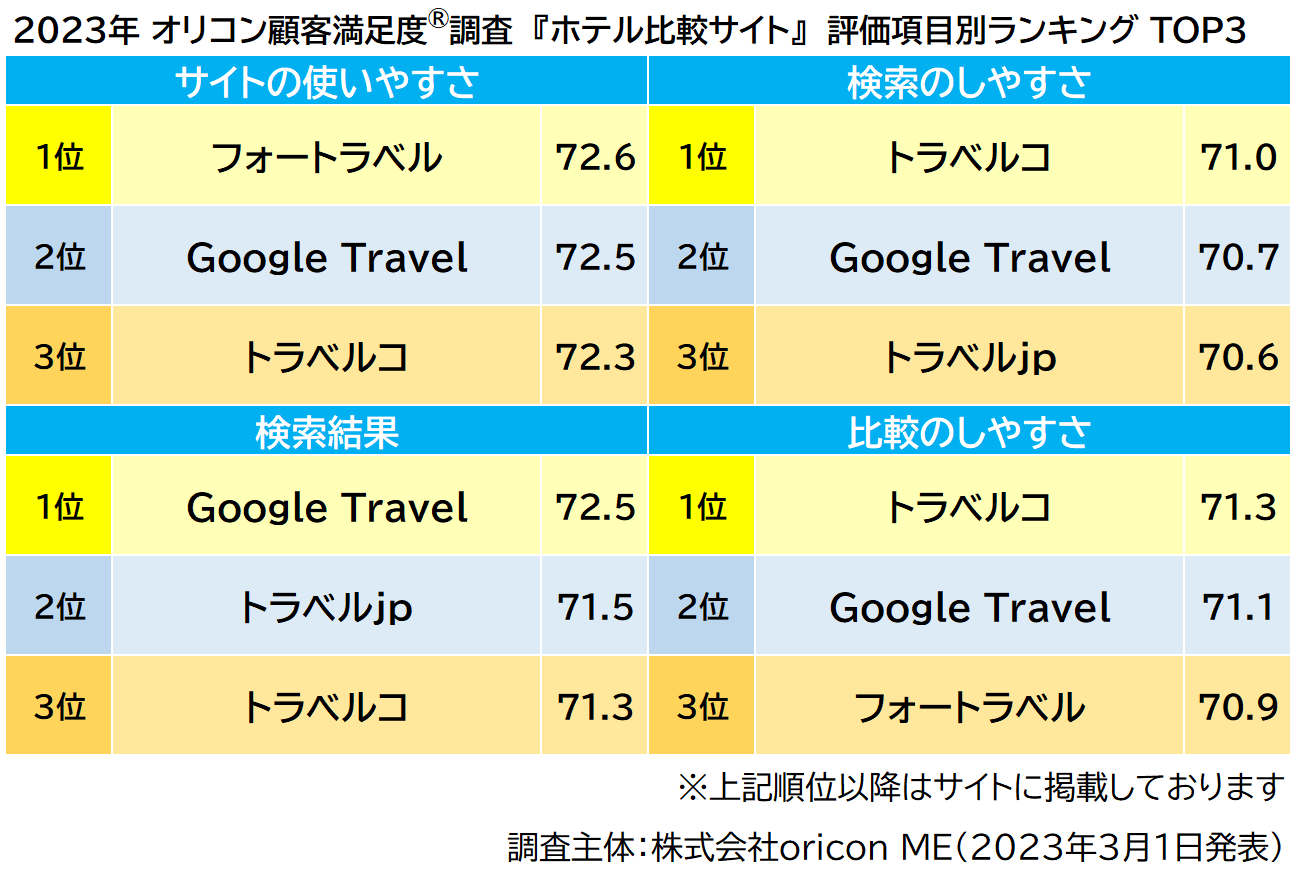 2019年の調査開始以降、4度目(2019,2020,2022,2023年)の発表となる『ホテル比較サイト』ランキングでは、【Google Travel(Google合同会社 本社:東京都渋谷区)】が、初の総合1位を獲得しました。